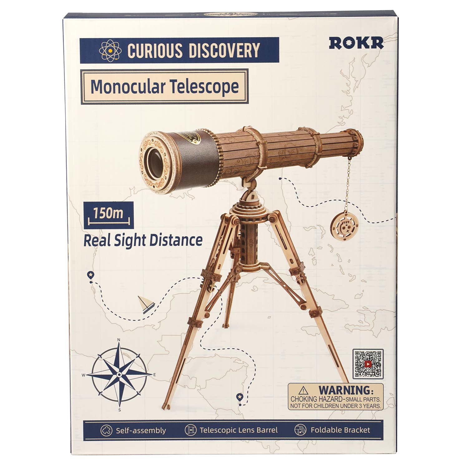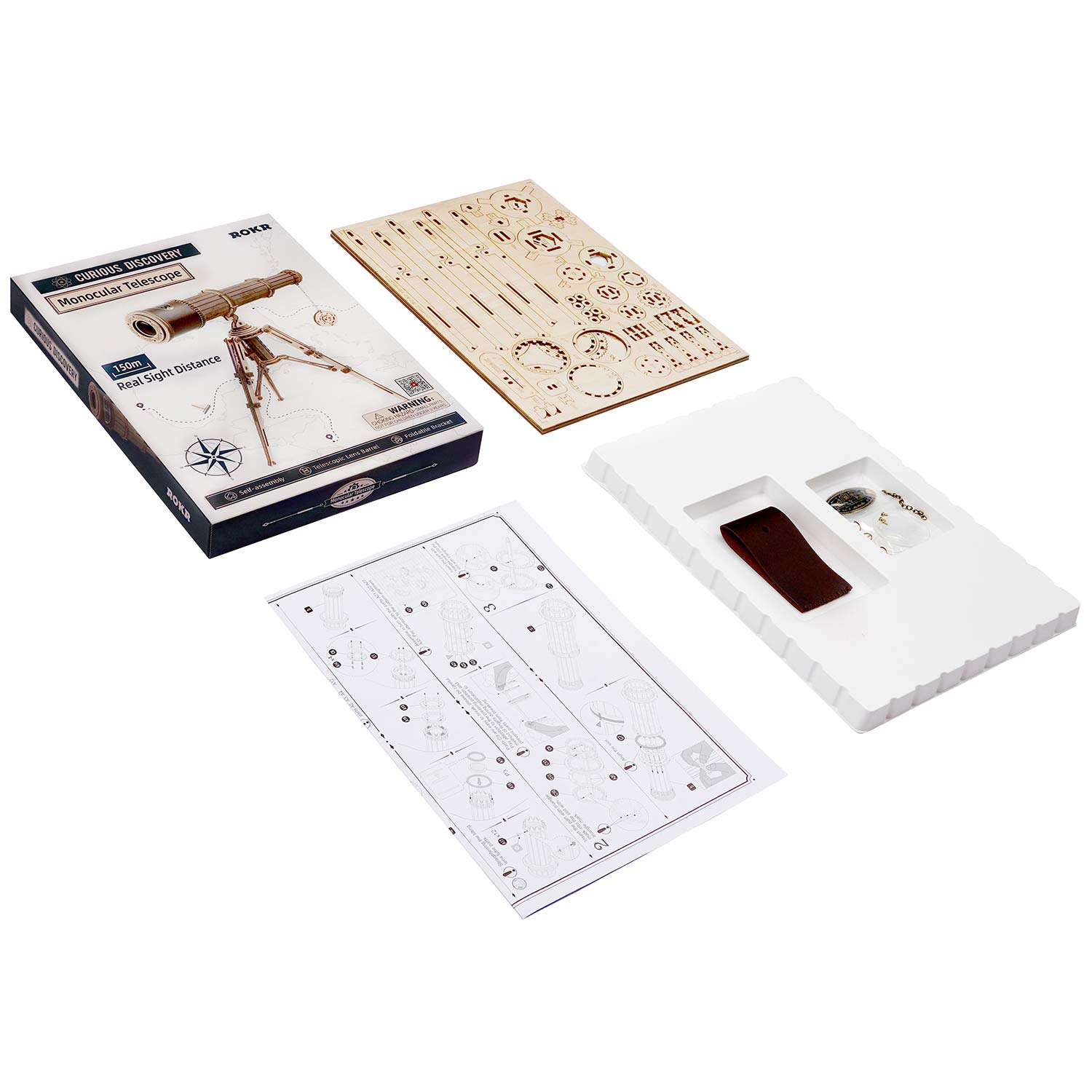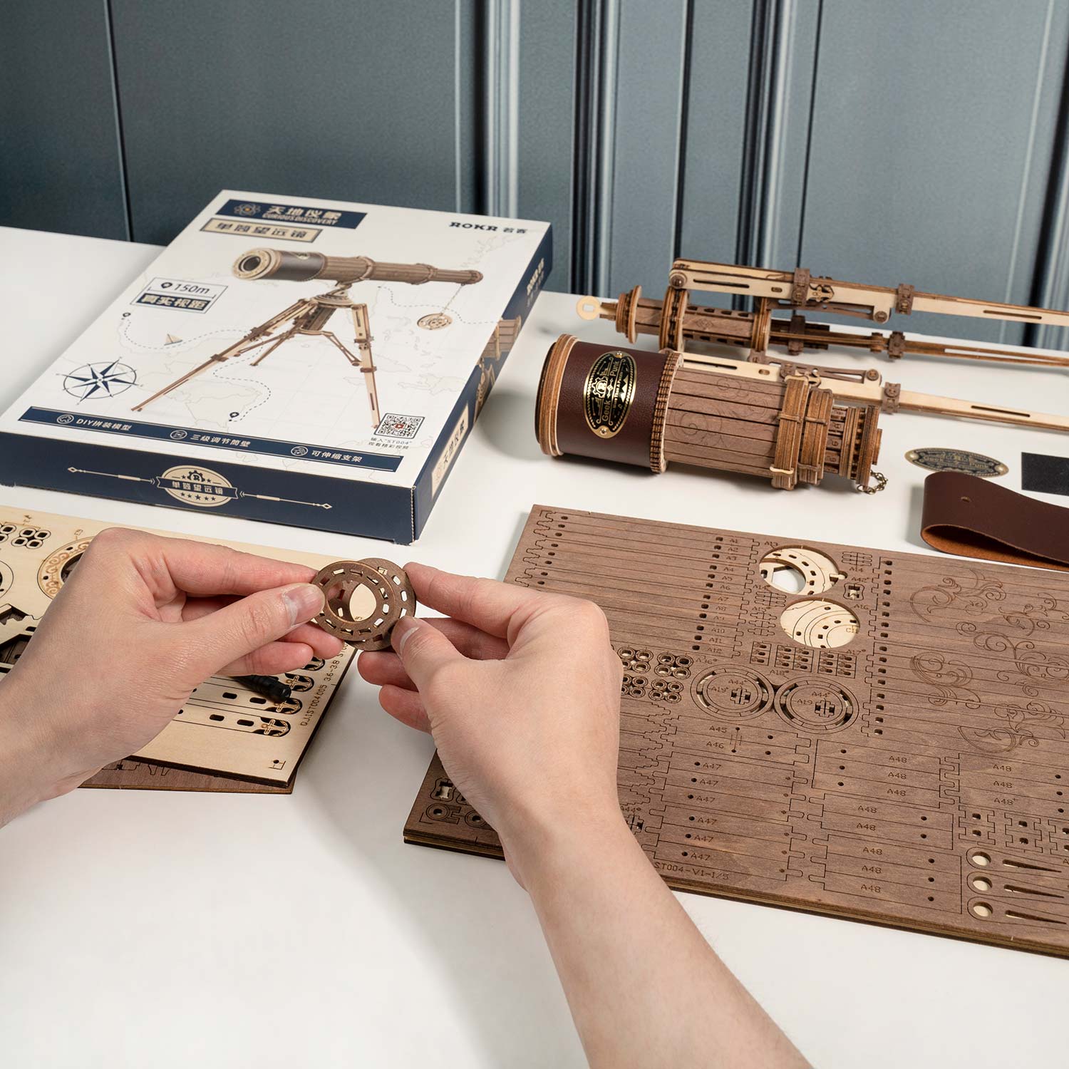 Das Monocular Telescope von Rokr ist ein mechanisches Modell. Es ist mit einem zusammenklappbaren Ständer ausgestattet. Das Teleskop hat eine echte Sichtweite von 150 Metern und ist mit Accessoires wie dekorativen Leder und einer Metallplatte ausgestattet. Der Bausatz besteht aus 314 Teilen.