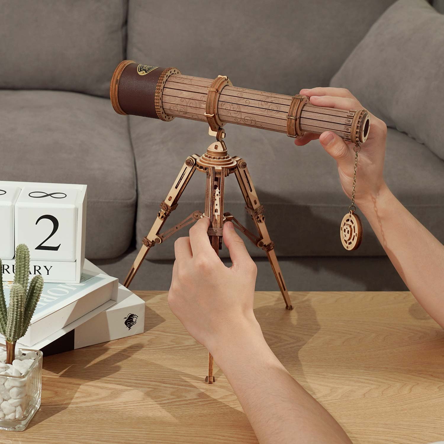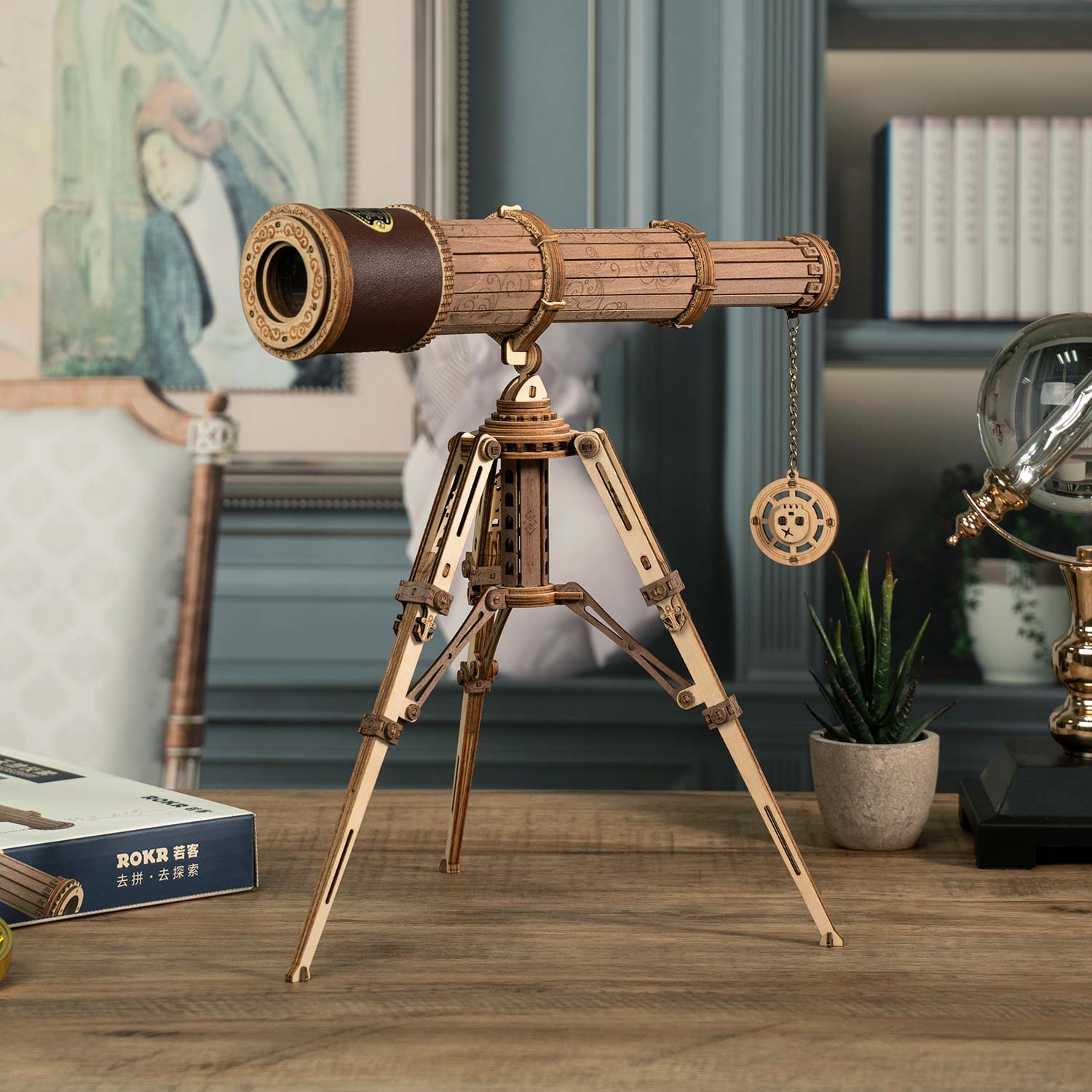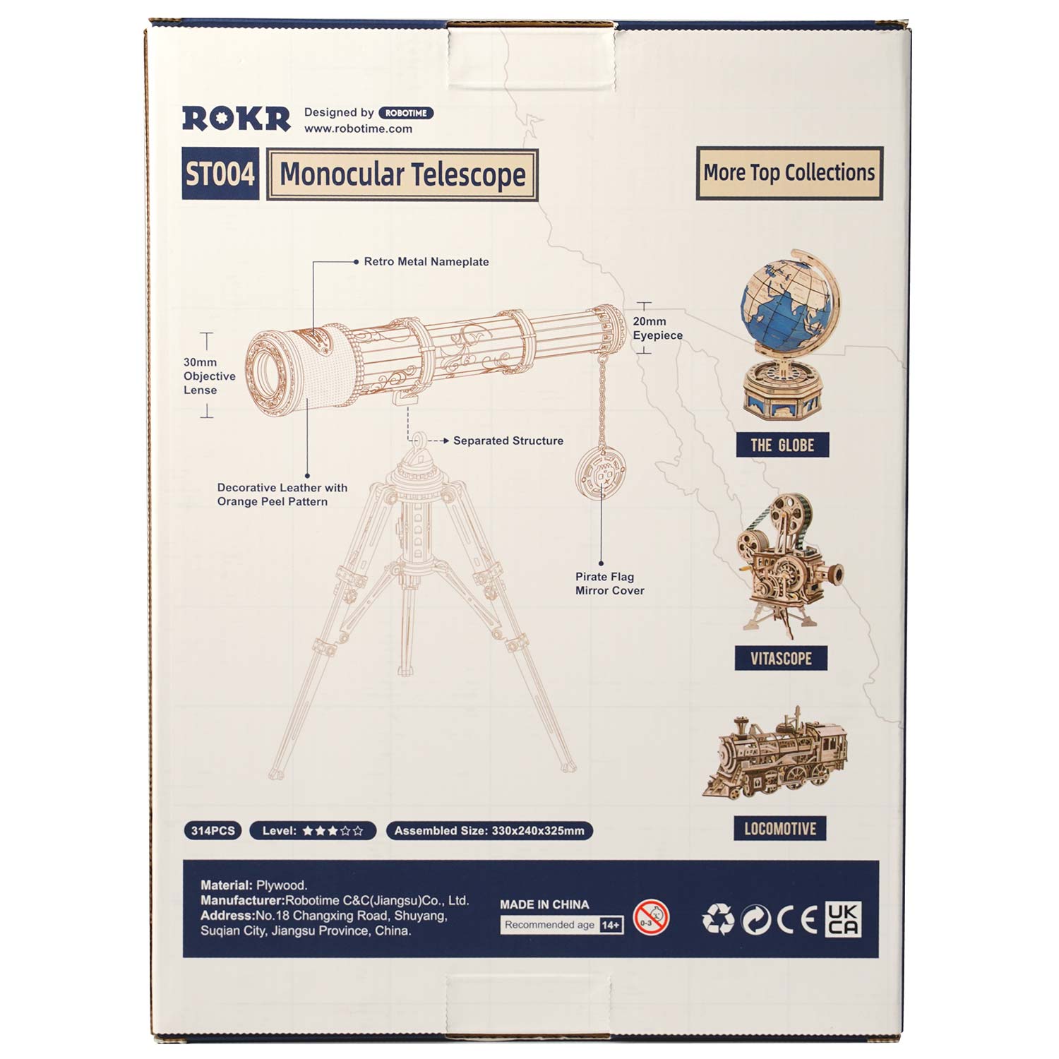 Das Monocular Telescope von Rokr ist ein mechanisches Modell. Es ist mit einem zusammenklappbaren Ständer ausgestattet. Das Teleskop hat eine echte Sichtweite von 150 Metern und ist mit Accessoires wie dekorativen Leder und einer Metallplatte ausgestattet. Der Bausatz besteht aus 314 Teilen.