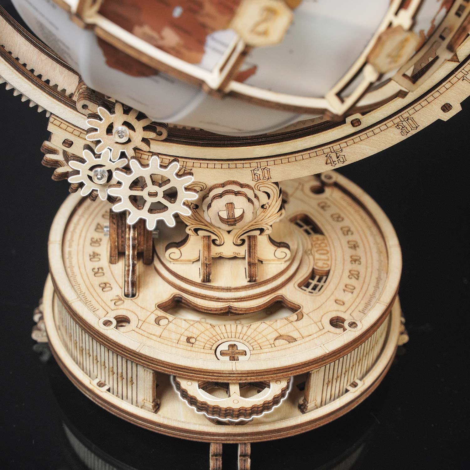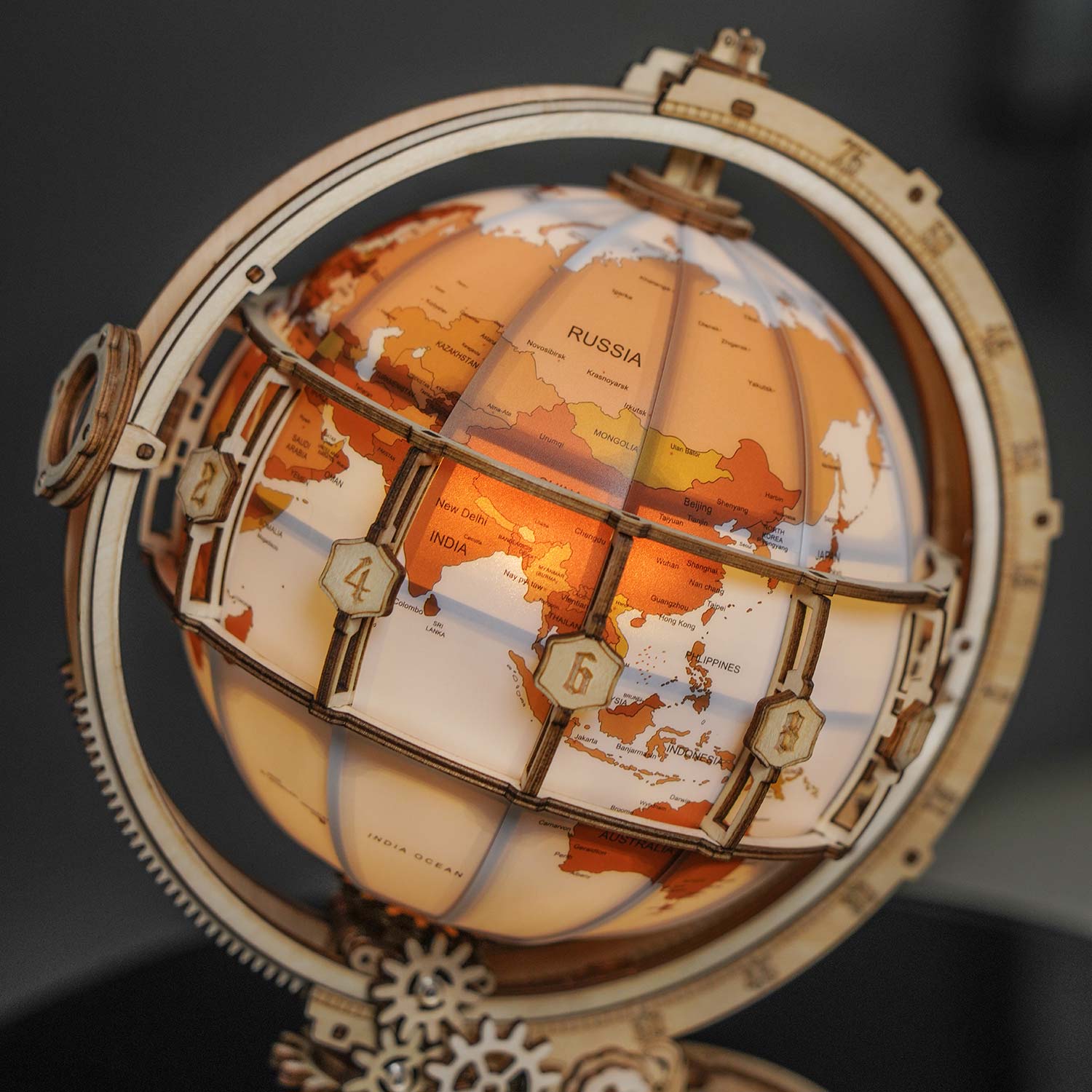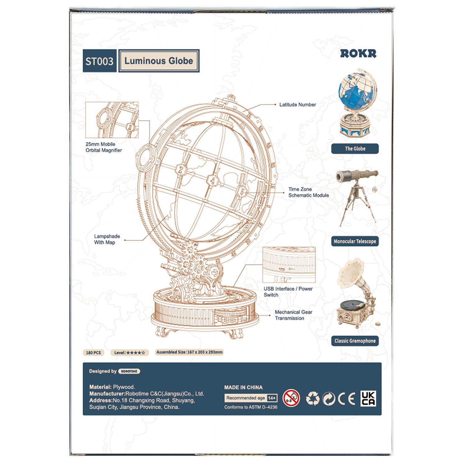 Der Luminous Globe von Rokr ist ein Bausatz für einen beleuchteten Globus. Der Bausatz beinhaltet neben den Holzteilen auch alle technischen Teile, um den Globus zu beleuchten. Er ist mit einer USB-Schnittstelle ausgestattet. Über mechanische Räder kann der Globus gedreht werden. Der Bausatz besteht aus 180 Teilen.