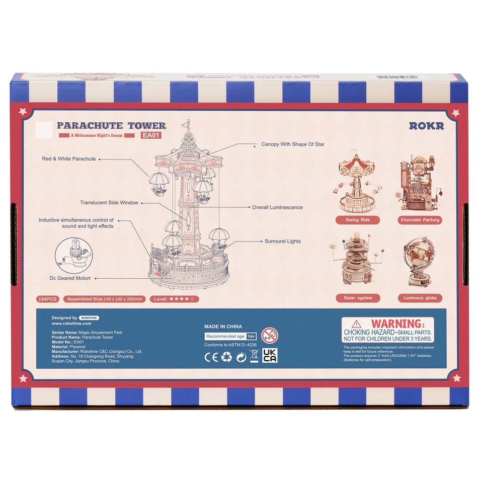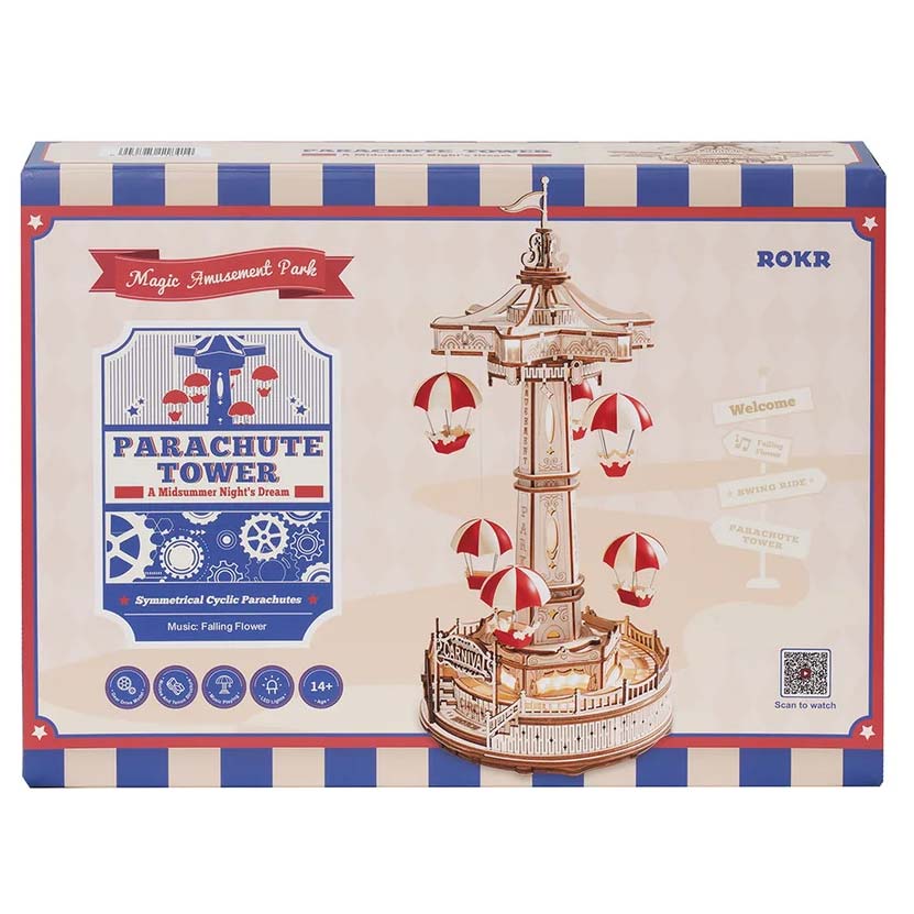 Das Modell Parachute Tower ist eine DIY Music Box. Der Bausatz besteht aus 184 Teilen und beinhaltet alle notwendigen technischen Elemente, damit sich die Fallschirme von alleine bewegen können. Während der Bewegung wird "Falling Flower" gespielt. Das Modell ist außerdem mit Licht ausgestattet.