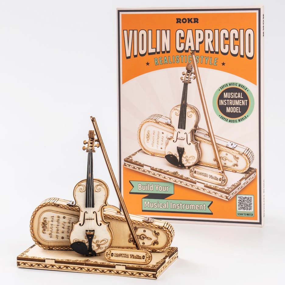 Das Modell Violin aus der Serie "Realistic Style" von Rokr. Der Bausatz besteht aus 62 Teilen. Das Modell ist ein Standmodell ohne mechanische Funktionen. Dafür ist das Modell mit zahlreichen Details ausgestattet.