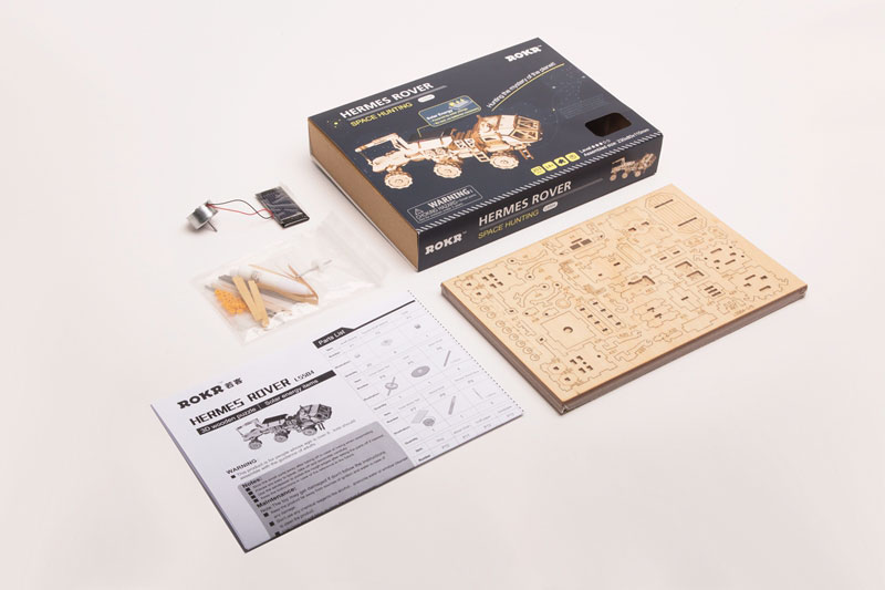 Rokr ist eine Marke des chinesischen Herstellers Robotime. Die mechanischen Holz-Bausätze von Rokr bestehen aber nicht komplett aus Holz, sondern setzen auch wenige Teile aus Metall und Kunststoff ein, um die mechanischen Funktionen robuster und lauffähiger zu gestalten.