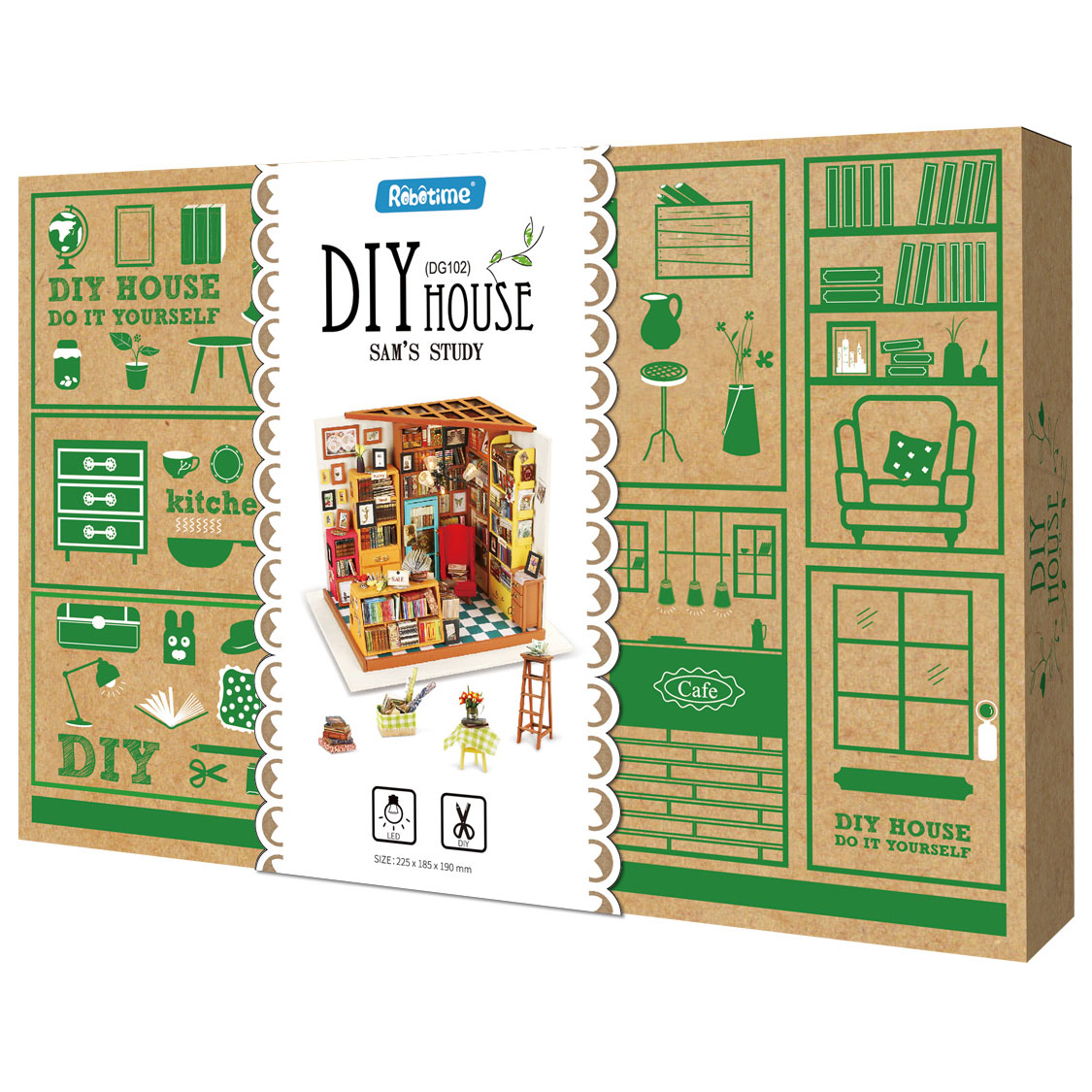 Der Bausatz "Sam's Study" aus der DIY Miniature House Serie von Rolife. Das Arbeitszimmer ist aufgebaut ca. 22,5 x 18,5 x 19 cm groß.