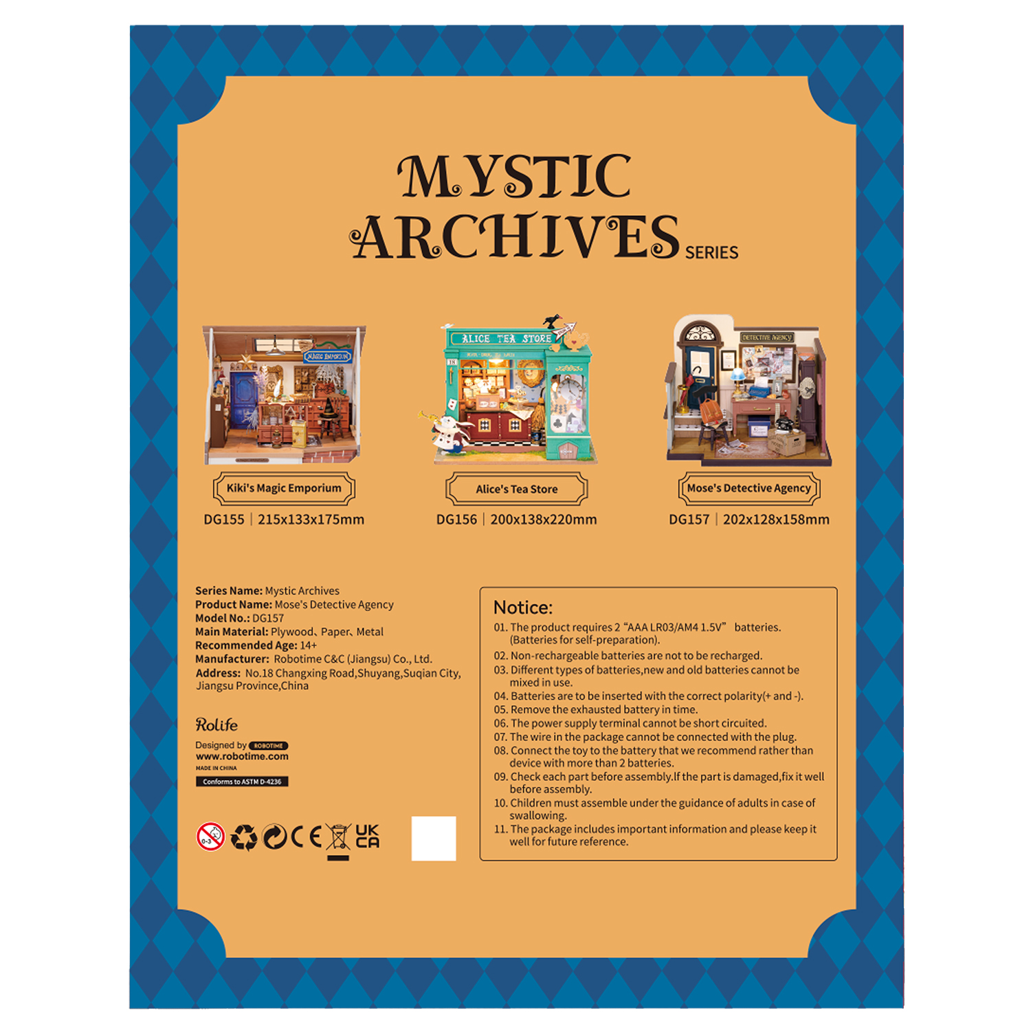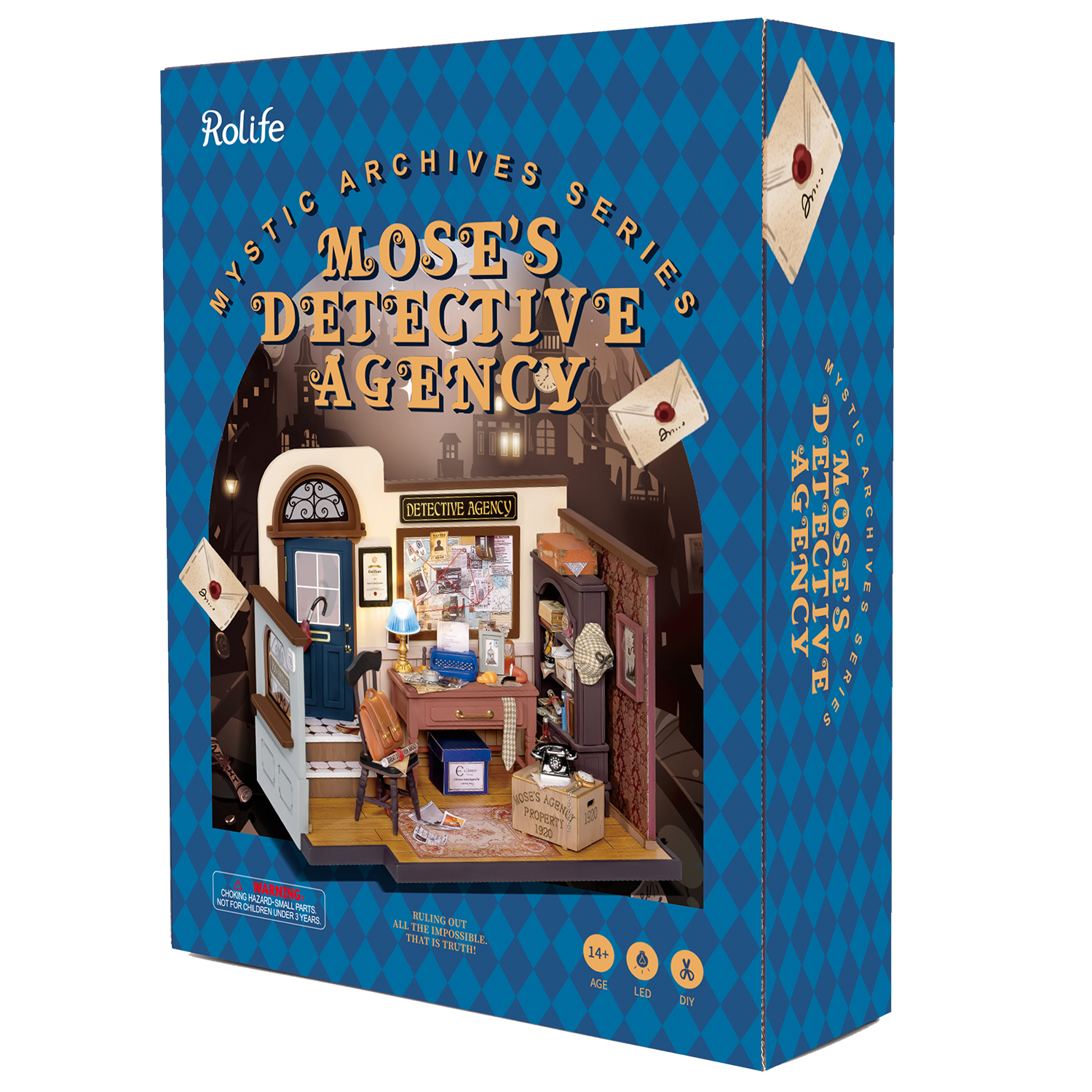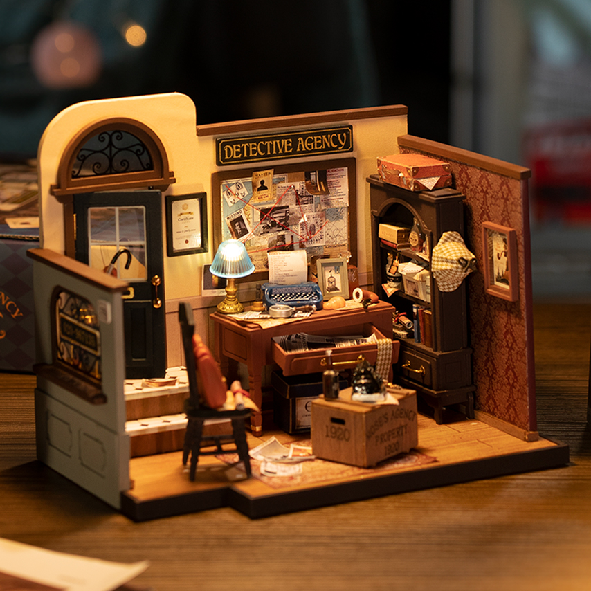 Der Bausatz "Mose's Detective Agency" aus der DIY Miniature House Serie von Rolife. Die Detekjtei ist aufgebaut ca. 22 x 12 x 18 cm groß und ist mit Licht ausgestattet.