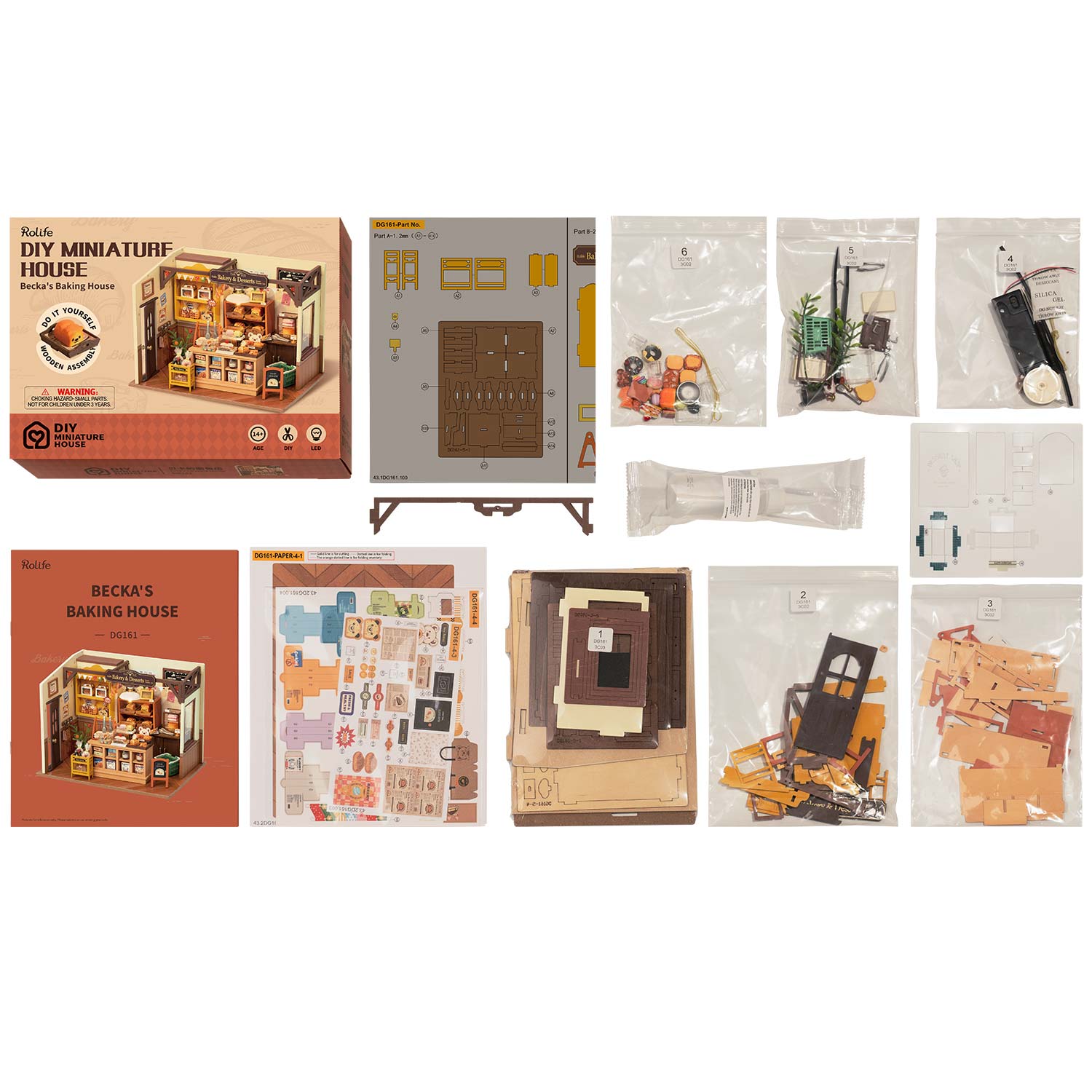 Die DIY Miniature Houses von Rolife sind im Maßstab 1:24 angelegt. Die Bausätze bestehen aus vielen einzelnen Zubehörteilen, die in separaten Beuteln sortiert sind. Für den Aufbau gibt es eine Schritt-für-Schritt-Anleitung, benötigte Farbe, Klebstoff und kleine Werkzeuge wie Pinsel, Pfeile oder Pinzette sind im Lieferumfang enthalten. Der Bausatz besteht aus umweltfreundlichen Materialien, die Farbe ist geruchlos und kann auch leicht mit Wasser ausgewaschen werden.