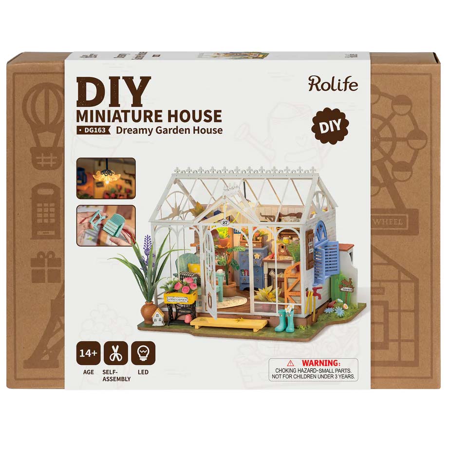 Der Bausatz "Dreamy Garden House" aus der DIY Miniature House Serie von Rolife. Das Gartenhaus ist aufgebaut ca. 24,5 x 19 x 19 cm groß.