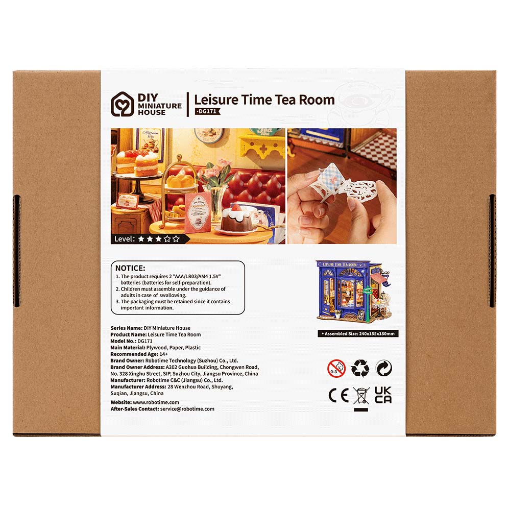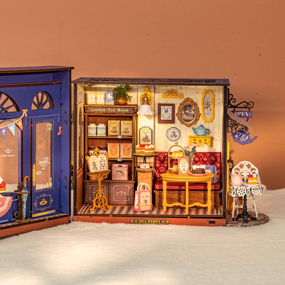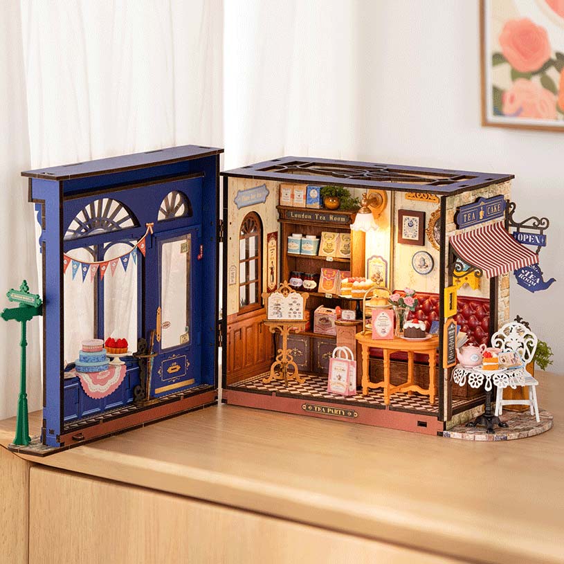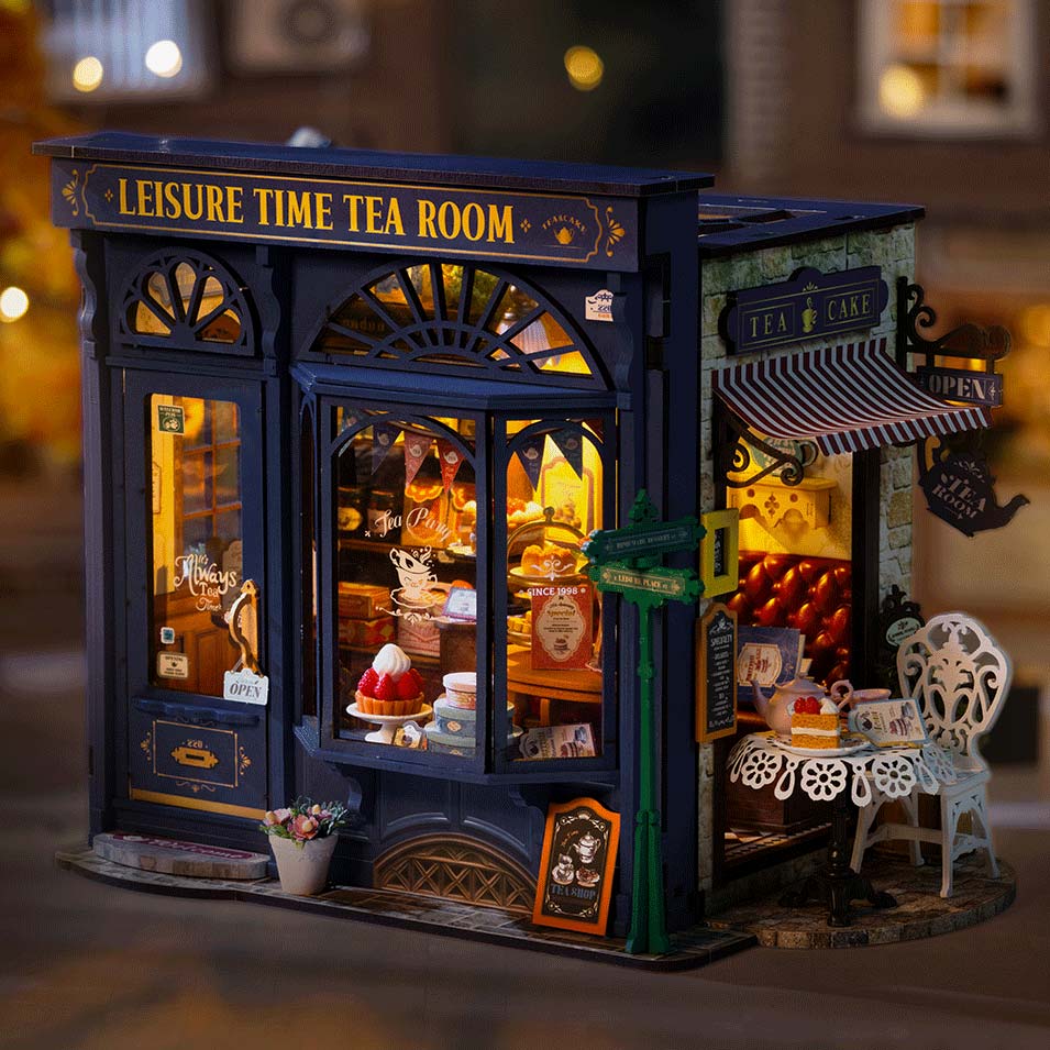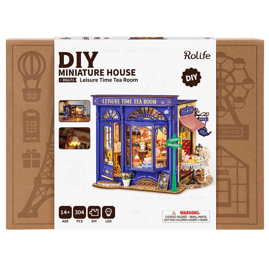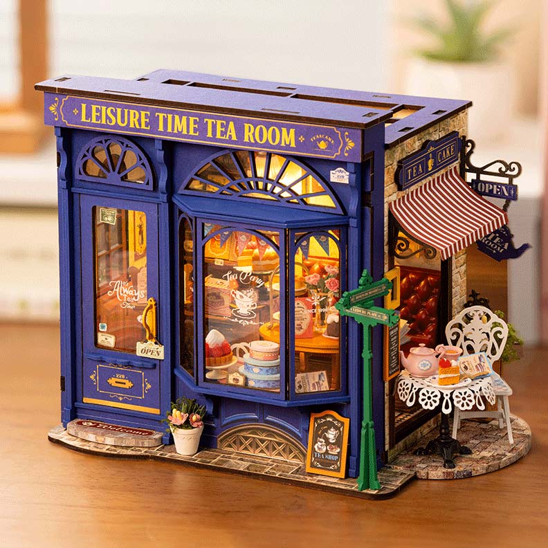 Der Bausatz "Leisure Time Tea Room" aus der DIY Miniature House Serie von Rolife. Der Teeladen ist aufgebaut ca. 24 x 15,5 x 18 cm groß.