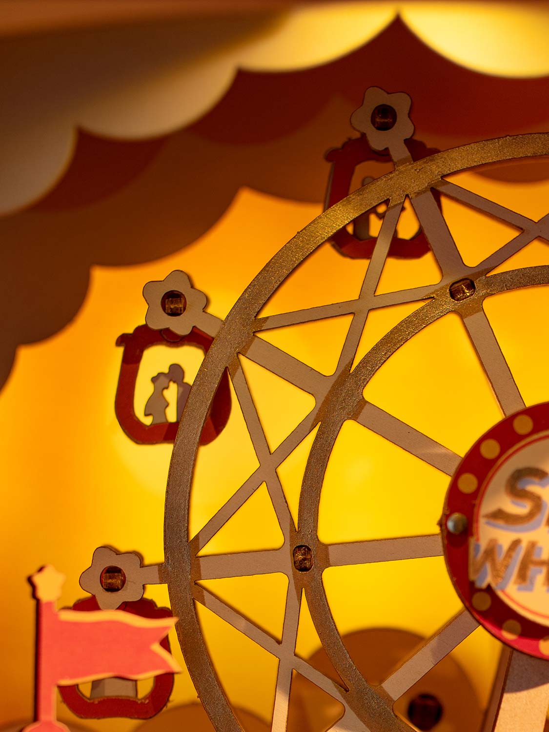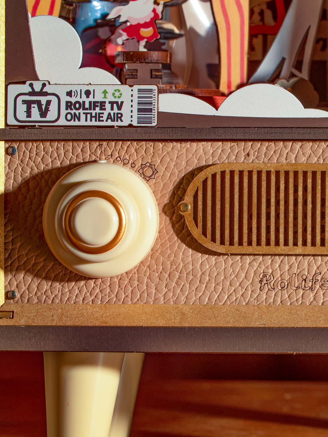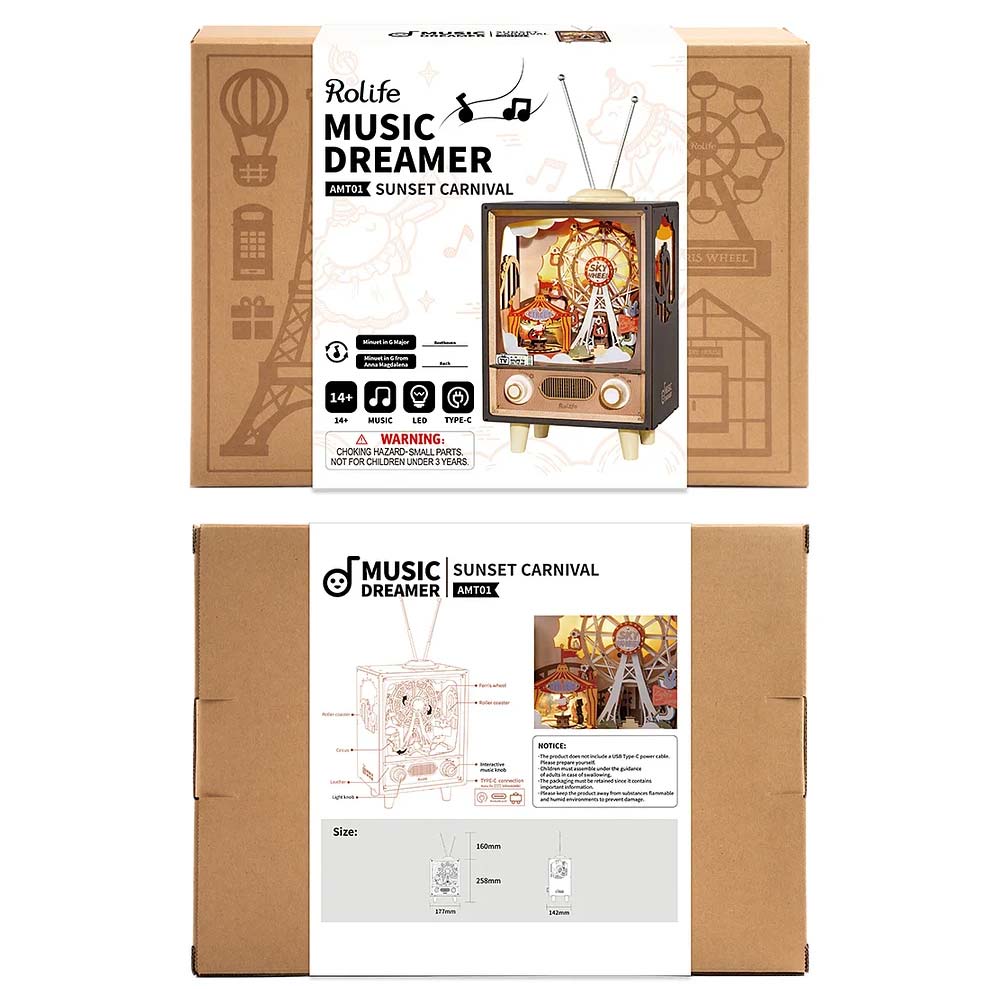 Sunset Carnival ist eine Spieluhr im Vergnügungspark-Stil und nutzt das Fernsehen als Rahmen für die Erstellung einer kompletten Story-Szene. Das Oberlicht und die Hintergrundbeleuchtung erzeugen eine Atmosphäre wie bei einem Sonnenuntergang. Sonnenuntergang und Riesenrad spiegeln sich gegenseitig in ihrer Strahlkraft. Beobachten Sie jederzeit einen wunderschönen Sonnenuntergang in Ihrem Zimmer. Drehen Sie den linken Knopf am Fernseher, um die Lichter zu steuern. Drehen Sie den rechten Knopf, um die Musik abzuspielen: 1. Johann Sebastian Bach Menuett in G von Anna Magdalena; 2. Beethoven Menuett in G-Dur. Integrierte Porträtsilhouetten von Besuchern, Achterbahnsilhouetten usw. stellen die echte Vergnügungsparkszene wieder her. Die Zirkusszene in der Spieluhr fängt die Essenz kindlicher Unschuld und Fantasie ein. Ein besonderes Detail ist der Bär, der auf einem Einrad fährt, was für einen zusätzlichen Hauch von Laune und Nostalgie sorgt.
