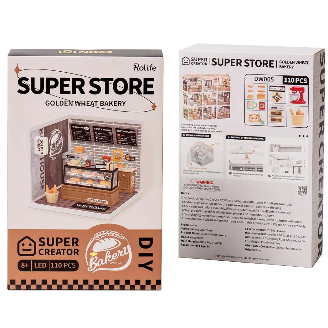 Der Bausatz "Golden Wheat Bakery" aus der DIY Super Store Serie von Rolife ist für sich ein kleiner Laden, kann aber zusammen mit anderen Super Store Modellen zusammengesetzt werden. So können die Modelle nebeneinander und übereinander gesetzt werden. Als Erweiterung gibt es auch noch Seitenwände und ein Dach. Das Modell ist aufgebaut ca. 16,3 x 16,3 x 15,2 cm groß. Anders als die bekannten Rolife Miniature Houses bestehen diese Bausätze vor allem aus Plastik und sind deutlich leichter zusammenzubauen.