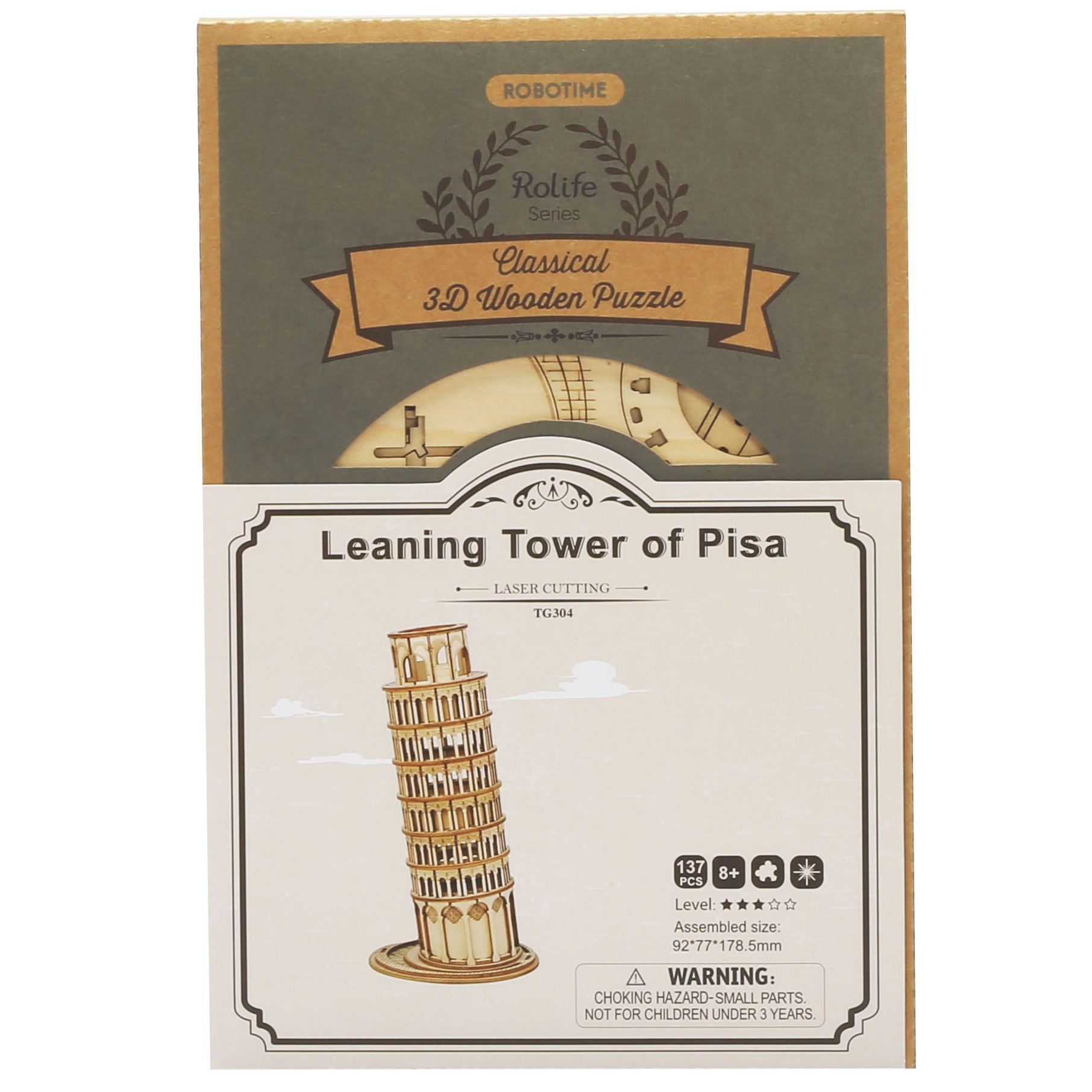 Das Modell Leaning Tower of Pisa aus der Serie "Modern 3D Wooden Puzzle" von Rolife. Der Bausatz besteht aus 137 Teilen. Das Modell ist ein Standmodell ohne mechanische Funktionen. Dafür ist das Modell mit zahlreichen Details ausgestattet.