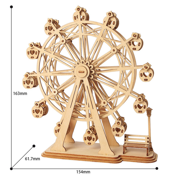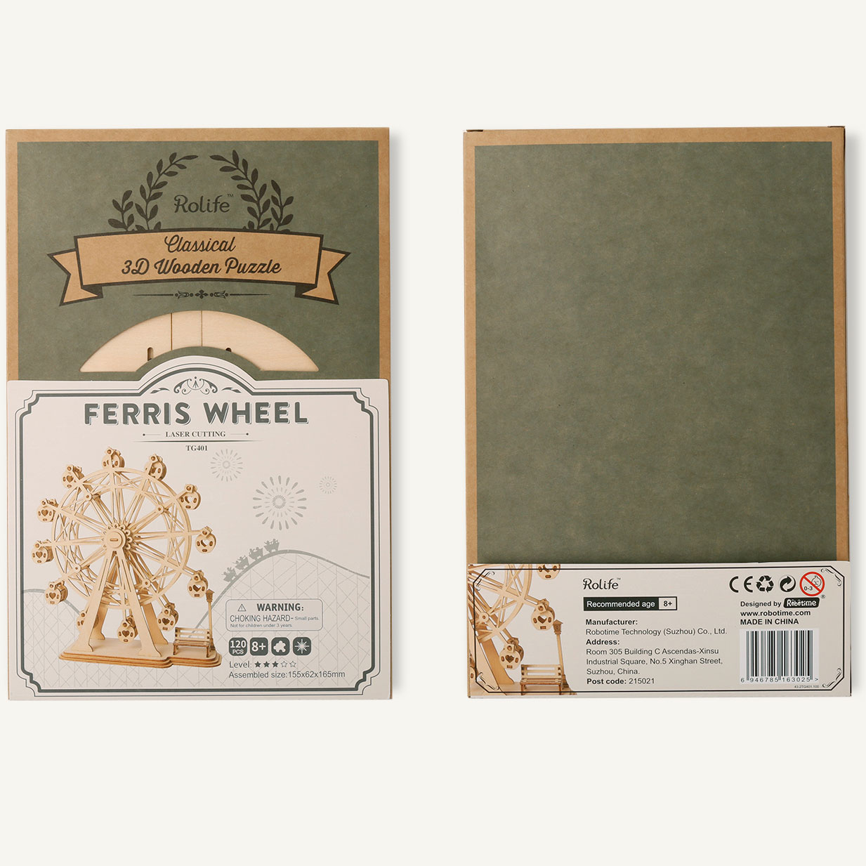 Das Modell Ferris Wheel aus der Serie "Modern 3D Wooden Puzzle" von Rolife. Der Bausatz besteht aus 120 Teilen. Das Modell ist ein Standmodell ohne mechanische Funktionen. Dafür ist das Modell mit zahlreichen Details ausgestattet.