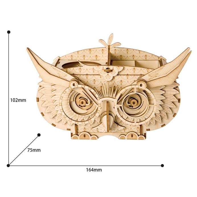 Das Modell Owl Shortage Box aus der Serie "Modern 3D Wooden Puzzle" von Rolife. Der Bausatz besteht aus 61 Teilen. Das Modell ist ein Standmodell ohne mechanische Funktionen.