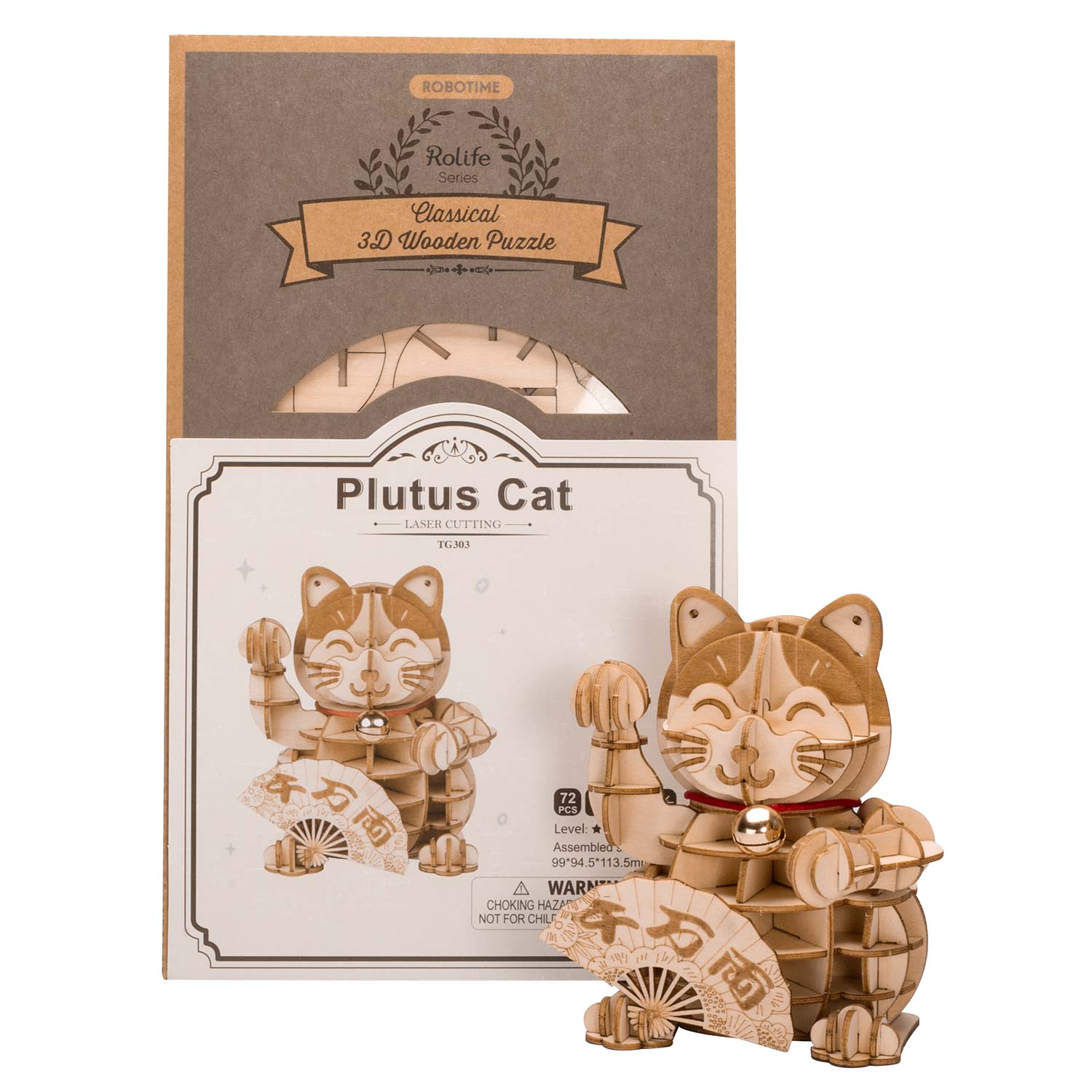 Das Modell Plutus Cat aus der Serie "Modern 3D Wooden Puzzle" von Rolife. Der Bausatz besteht aus 72 Teilen. Das Modell ist ein Standmodell ohne mechanische Funktionen.