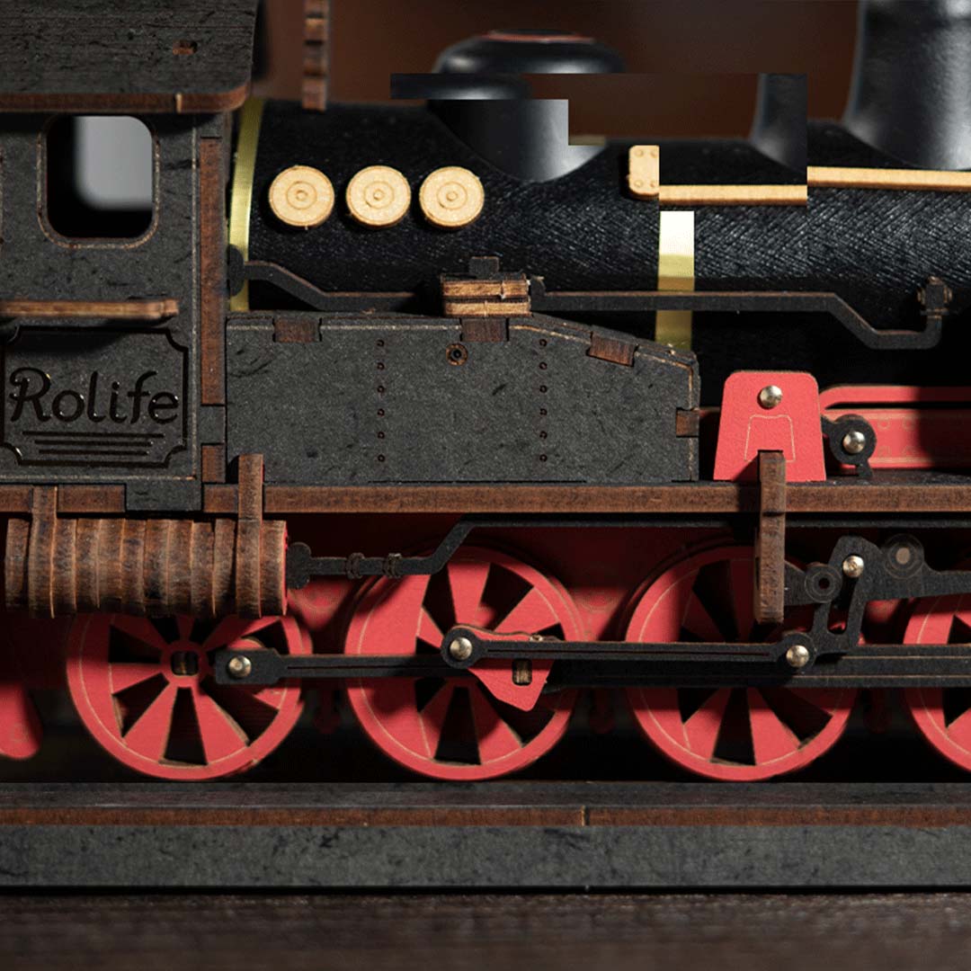 Der Bausatz Steam Journey ist ein Miniatur-Holzpuzzle einer europäisch inspirierten, historischen Lokomotive. Das Modell umfasst die Lokomotive, einen Personenwagen, Gleise und einen Bahnhof. Lassen Sie sich in eine Ära der Eleganz und Geschichte entführen, in der die Eisenbahn die Straßen beherrschte und Dampf die Lokomotiven antrieb. Mit seinem satten schwarz-roten Thema und der glänzenden Goldverzierung bietet Ihnen dieses Wunderwerk an Stärke und Raffinesse ein erstklassiges Reiseerlebnis, das an europäische Züge des 19. Jahrhunderts erinnert.