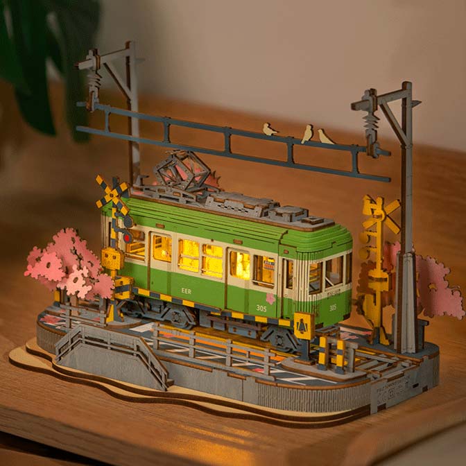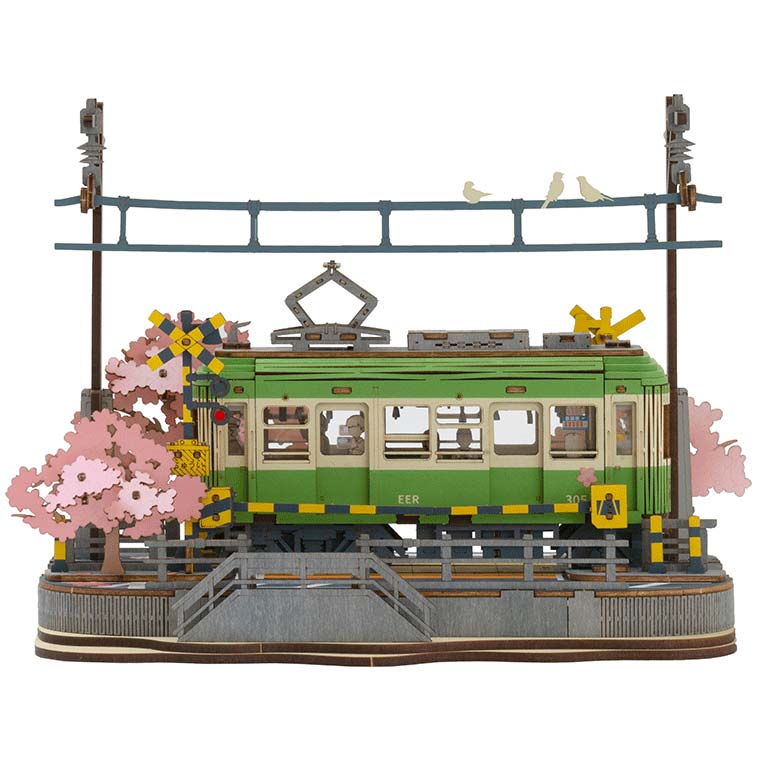 Der Bausatz "Sakura Journex" von Rolife besteht aus 223 Teilen. Das 3D-Puzzle zeigt eine Straßenbahn mit Straßenbäumen