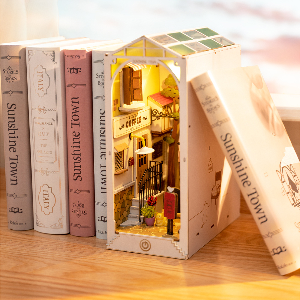 Der Bausatz "Sunshine Town" aus der Stories in Books-Serie von Rolife. Der Bausatz enthält alles, was Sie zum Bauen dieser Mini-Stadt-Szene benötigen. Mit all den Holzteilen und Werkzeugen werden Sie nach und nach die gesamte Szene wie Geschäfte, Straße, Bäume, Uhr usw. zusammenbauen. Diese Bücherecke wird auch eine einzigartige und exquisite Dekoration für Ihr Bücherregal und Ihren Schreibtisch sein. Im Dunkeln können Sie die Szenereie mit den mitgelieferten Lichtern in Szene setzen.