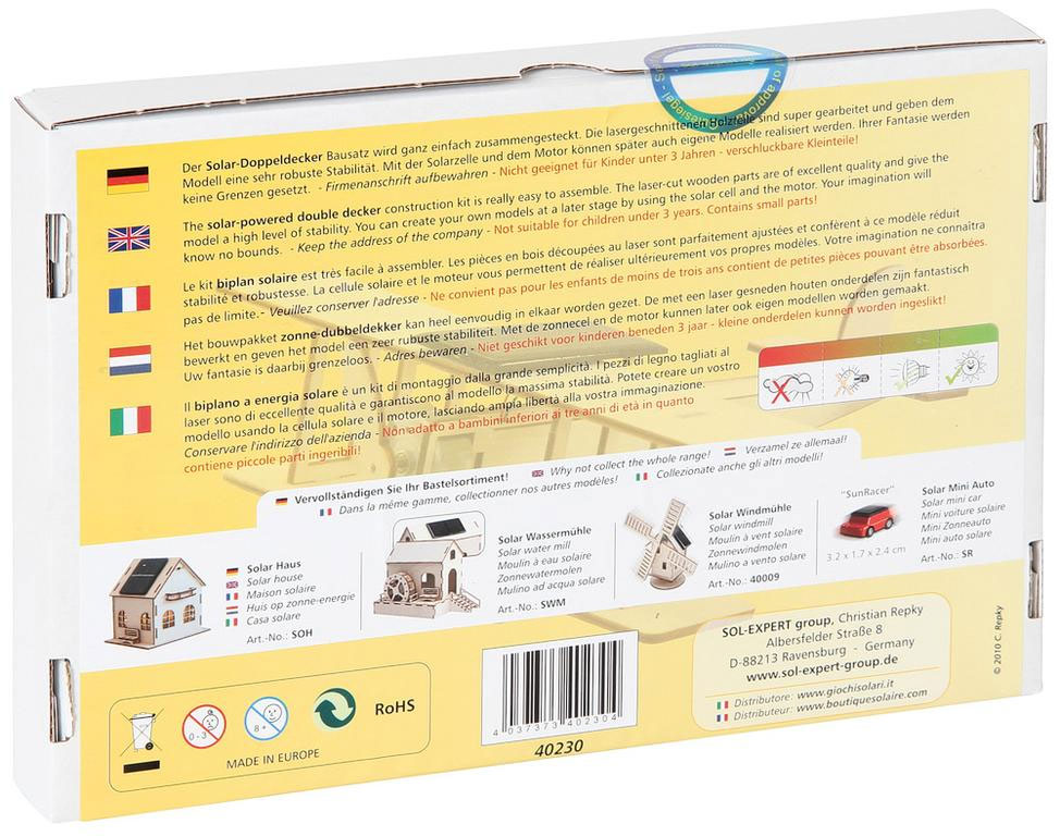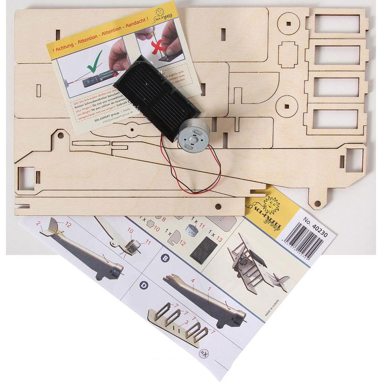 Der Solar-Doppeldecker-Bausatz wird ganz einfach zusammengesteckt. Die lasergeschnittenen Holzteile sind super gearbeitet und geben dem Modell eine sehr robuste Stabilität. Mit der Solarzelle und dem Motor können später auch eigene Modelle realisiert werden. Ihrer Phantasie ist keine Grenze gesetzt.