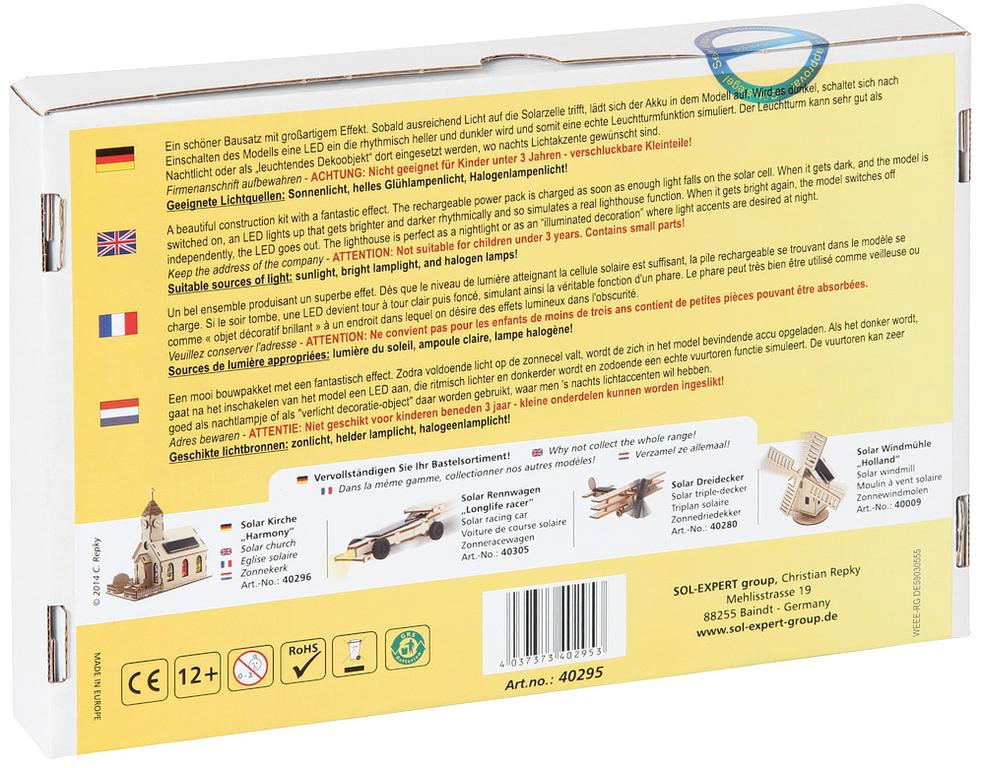 Ein schöner Bausatz mit großartigem Effekt. Sobald genügend Licht auf die Solarzelle trifft, lädt sich der Akku in dem Modell auf. Wird es dunkel, schaltet sich nach Einschalten des Modells eine LED ein, die rhythmisch heller und dunkler wird und somit eine echte Leuchtturmfunktion simuliert. Der Leuchtturm kann sehr gut als Nachtlicht oder als leuchtendes Dekoobjekt dort eingesetzt werden, wo nachts Lichtakzente gewünscht sind.