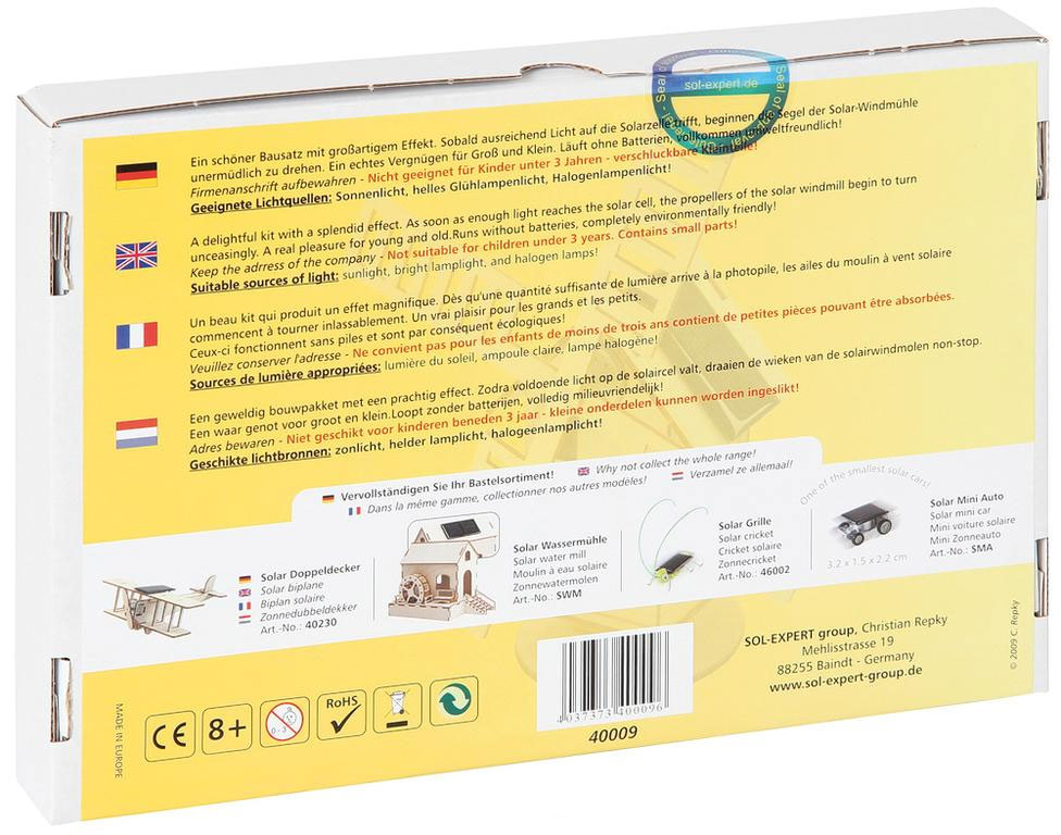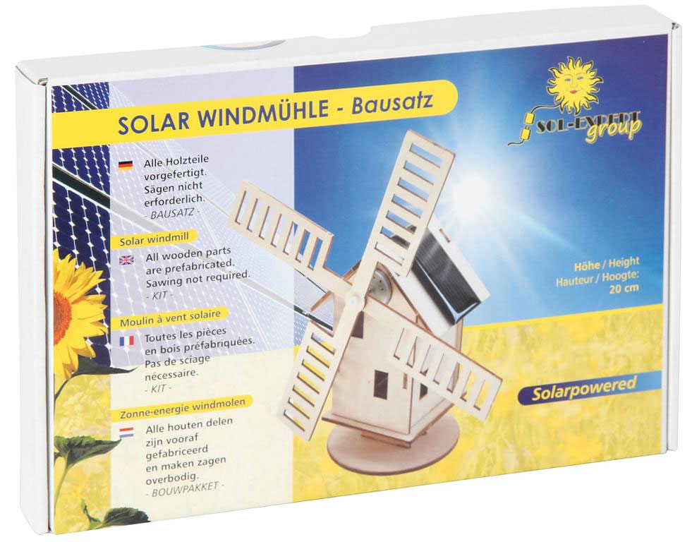 Ein schöner Bausatz mit großartigem Effekt. Sobald genügend Licht auf die Solarzelle trifft, beginnen die Segel der Solar-Windmühle sich zu drehen. Ein echtes Vergnügen für Groß und Klein. Läuft ohne Batterien, vollkommen umweltfreundlich.