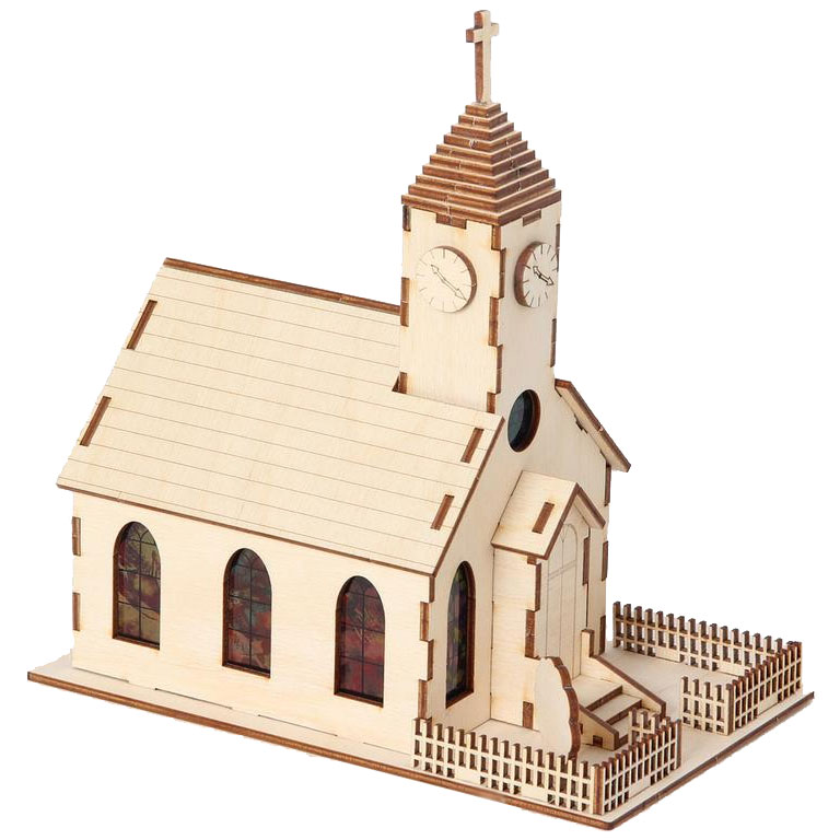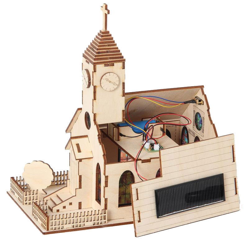 Ein schöner Bausatz mit großartigem Effekt. Sobald genügend Licht auf die Solarzelle trifft, lädt sich der im Modell befindliche Akku auf. Wird es dunkel, schaltet sich automatisch eine LED ein und lässt die farbigen Kirchenfenster nach außen erstrahlen. Wird es wieder hell, schaltet sich das Modell selbständig aus, die LED erlischt. Die Kirche kann sehr gut als Nachtlicht oder als leuchtendes Dekoobjekt dort eingesetzt werden, wo nachts Lichtakzente gewünscht sind.