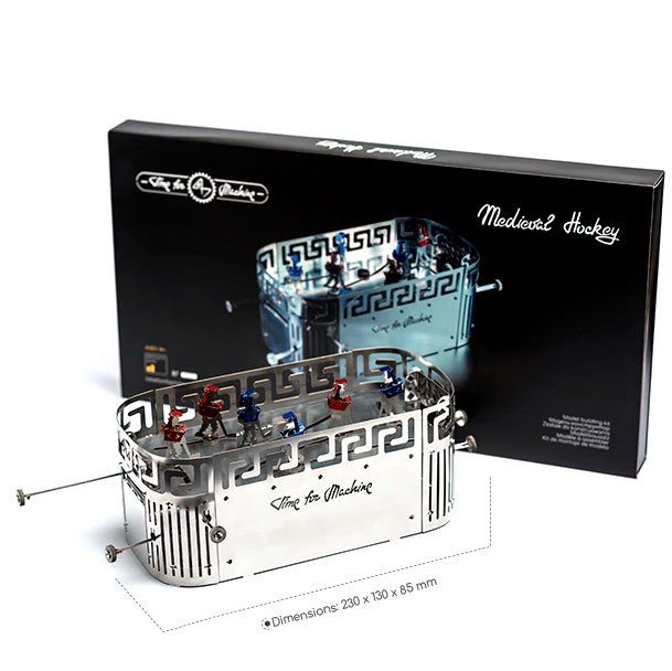 Medieval Hockey von Time for Machine ist ein Bausatz, mit dem Sie ein Mittelalterliches Hockeyspiel als Modell zusammenbauen können. Es spielen zwei Leute. Jede Person hat drei Spieler. Der aktive Torhüter, der Verteidiger und der Stürmer. Die Aufgabe besteht darin, einen kleinen schwarzen Hockey-Puck auf dem Spielfeld zu bewegen und ein Tor zu erzielen.