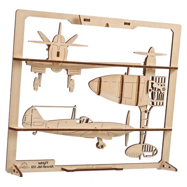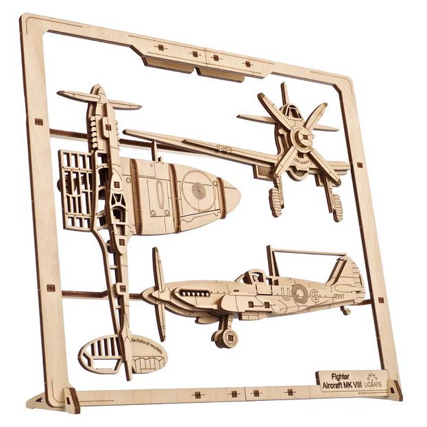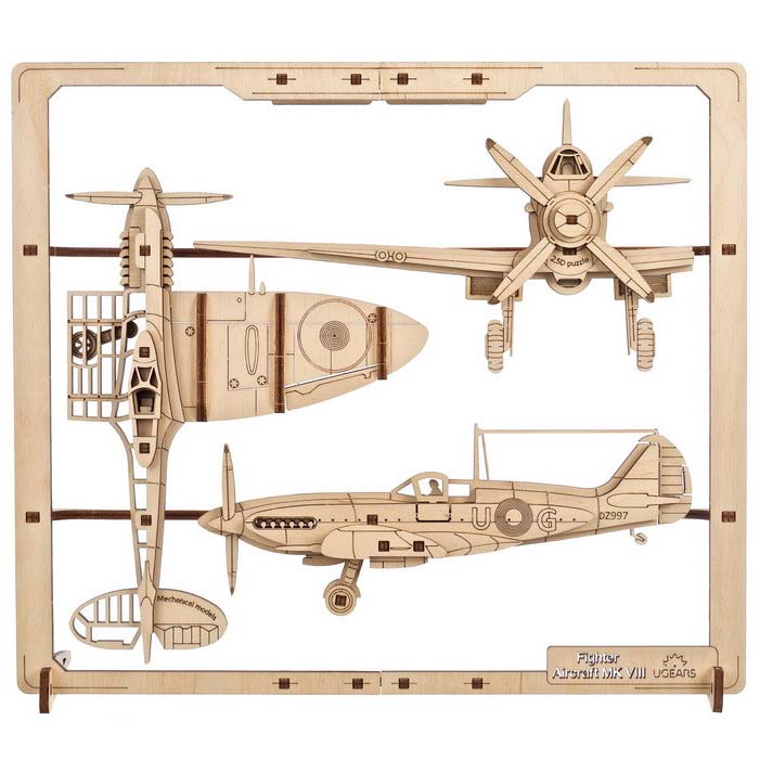 Der Kampfflieger von Ugears aus der Sammlung Klassische Fahrzeuge - die erste Serie in der neuen Reihe mit 2,5D-Puzzles von Ugears! Dieses coole 2,5D-Flugzeugmodell aus Holz zum Selberbauen hat bewegliche Elemente und seinen eigenen Rahmen. Darin kann es an die Wand gehängt oder auf dem Schreibtisch oder in einem Regal aufgestellt werden. Das Jagdflugzeug stellt eine klassische Spitfire der 1940er Jahren dar, das berühmte Kampfflugzeug, das die RAF und andere Alliierte im Zweiten Weltkrieg einsetzten. Das Bildmodell zeigt 3 Perspektiven (Vorderansicht, Draufsicht und Seitenansicht) und hat verschiedene bewegliche Teile, z.B. Querruder, Propeller, Räder und Cockpithaube, die Leben in Ihr Puzzle bringen!