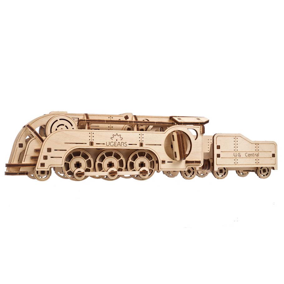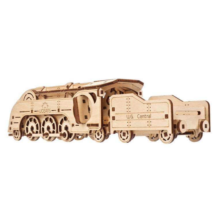 Die Mini-Eisenbahn von Ugears verfügt über einen Aufziehschlüssel, einen Start-/Stopp-Schalter zur einfacheren Handhabung sowie drei Radsätze mit Kuppelstangen, um den Zug auf ebenen Flächen schnell davonsausen zu lassen. An die Lokomotive ist ein offener Kohletender angekoppelt, in dem Sie Ihr Lieblingsspielzeug, etwas zum Knabbern oder einen kleinen Brief an einen netten Menschen quer durch den Raum auf die Reise schicken können!
