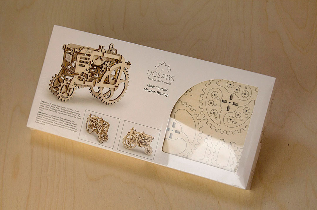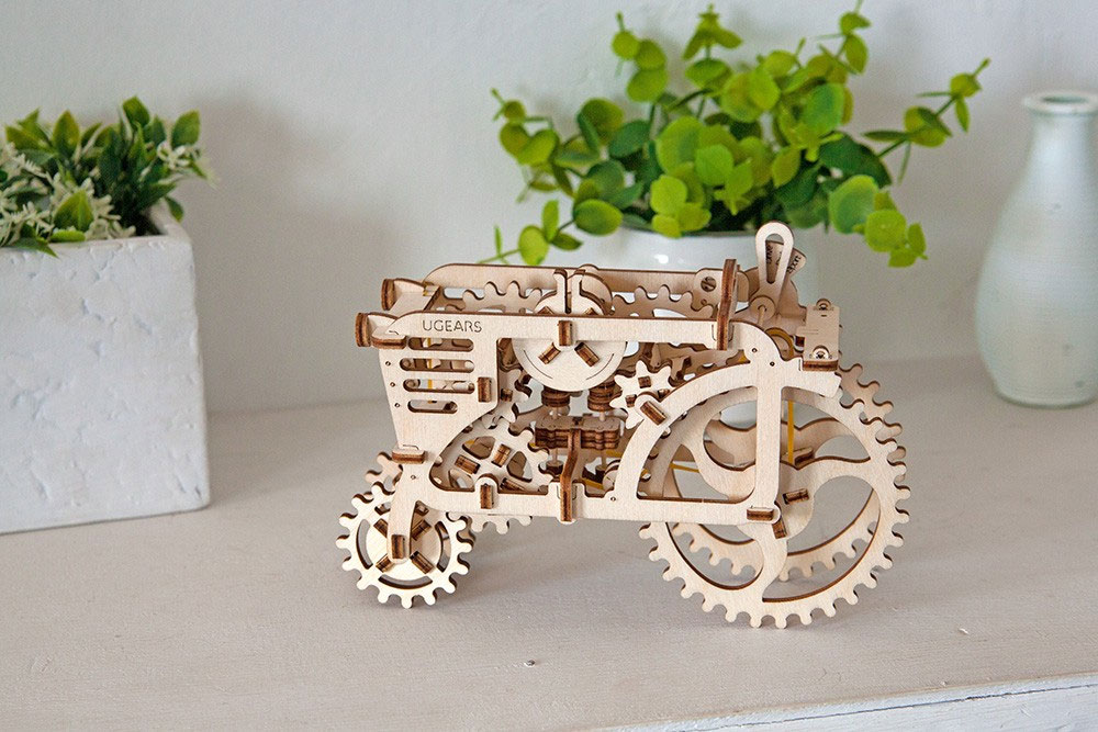 Der Ugears Tractor orientiert sich an Modellen aus dem vergangenen Jahrhundert und arbeitet ganz ohne elektronische Bauteile. Der Ugears Traktor wird über einen Gummimotor angetrieben und verfügt über einen Schalthebel mit 3 Gängen. Im 1. Gang (Parken) springt der Ugears Traktor an. Im 2. Gang (Fahren) beginnt er zu rattern und sich durch Betätigen der Kolben gemächlich fortzubewegen. Im 3. Gang (Sport) fährt er mit Höchstgeschwindigkeit.