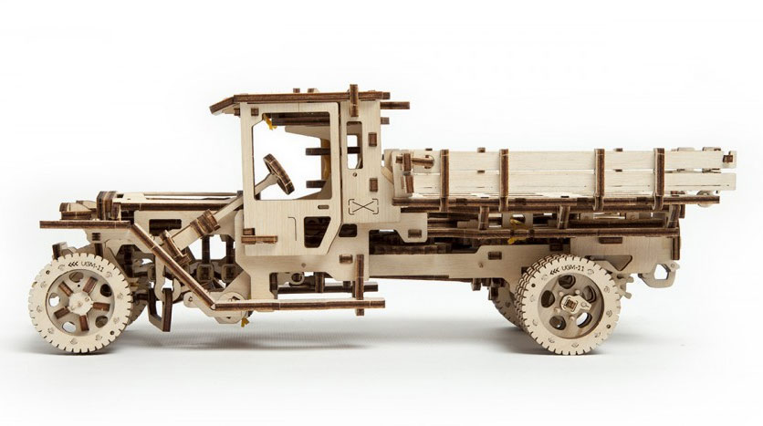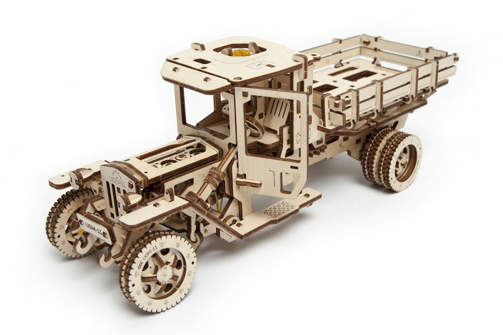 Der Ugears Truck (Lastwagen) verfügt mit einer Vielzahl von Funktionen über eine geradezu unglaubliche Raffinesse. Das Fahrzeug fährt, lenkt und beschleunigt wie ein echter LKW. Bewegliche Kolben, ein funktionsfähiges Lenkrad oder öffnende Türen und Klappen an der Ladefläche sind nur einige der detailreichen Funktionen des Modells. Bereit für eine Fahrt? Das Getriebe erlaubt Leerlauf, Vorwärts- oder Rückwärtsfahrten. Der Bau des Modells nimmt einige Zeit in Anspruch, doch wird der Bastler anschließend mit vielen mechanischen Funktionen belohnt.