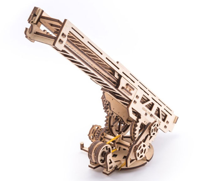 Die Drehleiter hat verschiedene mechanische Elemente. Sie besteht aus drei Leiterelementen, die bis zu einer Länge von 70 cm ausgefahren werden können. Der Leiterpark ist auf einer Drehplattform montiert, so dass Sie die Leiter nach links und rechts drehen können. Die aktuelle Position kann fixiert werden.