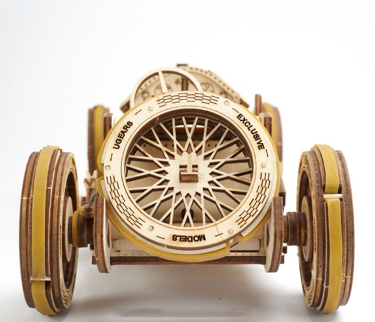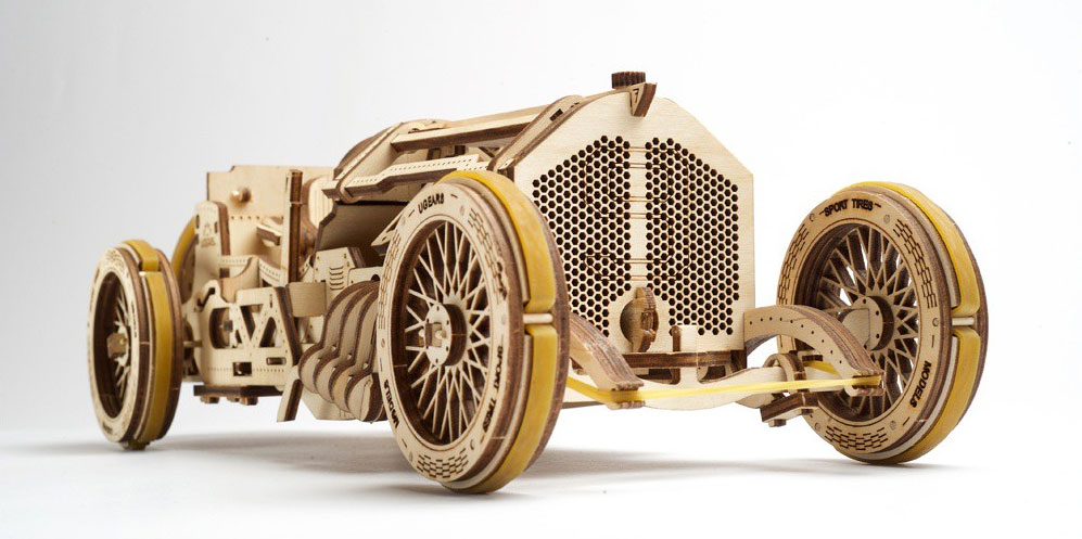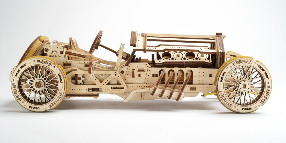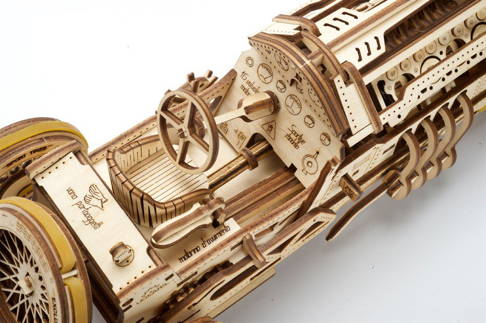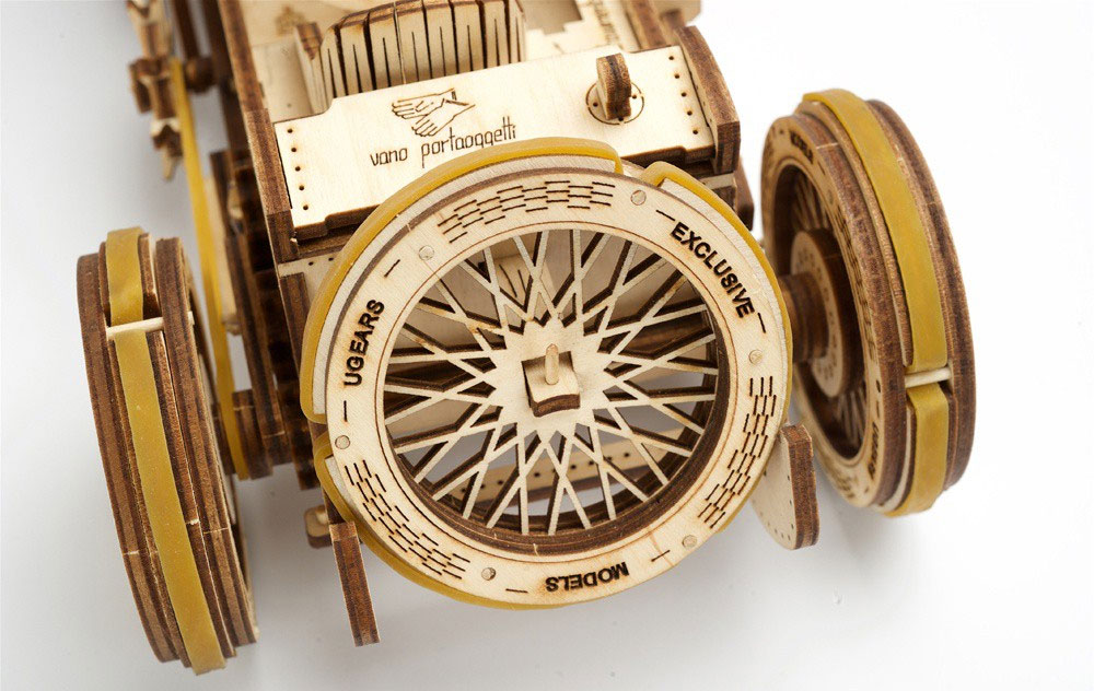 Das U-9 Grand Prix Car von Ugears ist ein echtes Schmuckstück. Das Design basiert auf den Rennsportwagen, die im frühen 20. Jahrhundert an den allerersten Grand Prix Rennen in Italien teilgenommen haben. Unter der Haube dieses Rennflitzers finden Sie einen V8-Motor mit einem leistungsstarken Lüfter und funktionierenden Ventilen. Als mechanische Funktion haben die Entwickler von Ugears das Modell mit einem Aufziehmotor ausgestattet, der über eine Kurbel an der Vorderseite aufgezogen wird. Das Getriebe bietet Gänge für Leerlauf, Rückwärtsgang und Rennen. Außerdem verfügt der Rennwagen über eine Federung und gummierte Reifen, die für eine sanfte, aber schnelle Beschleunigung und eine lange Reichweite sorgen.