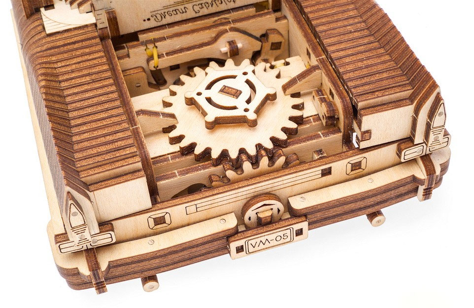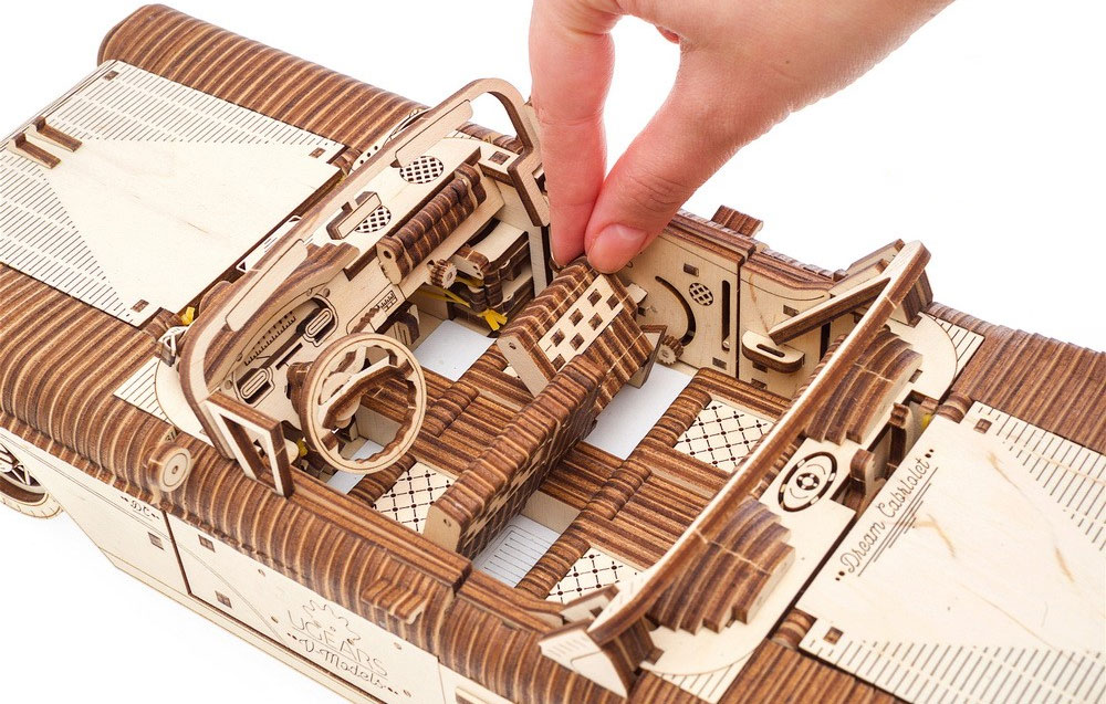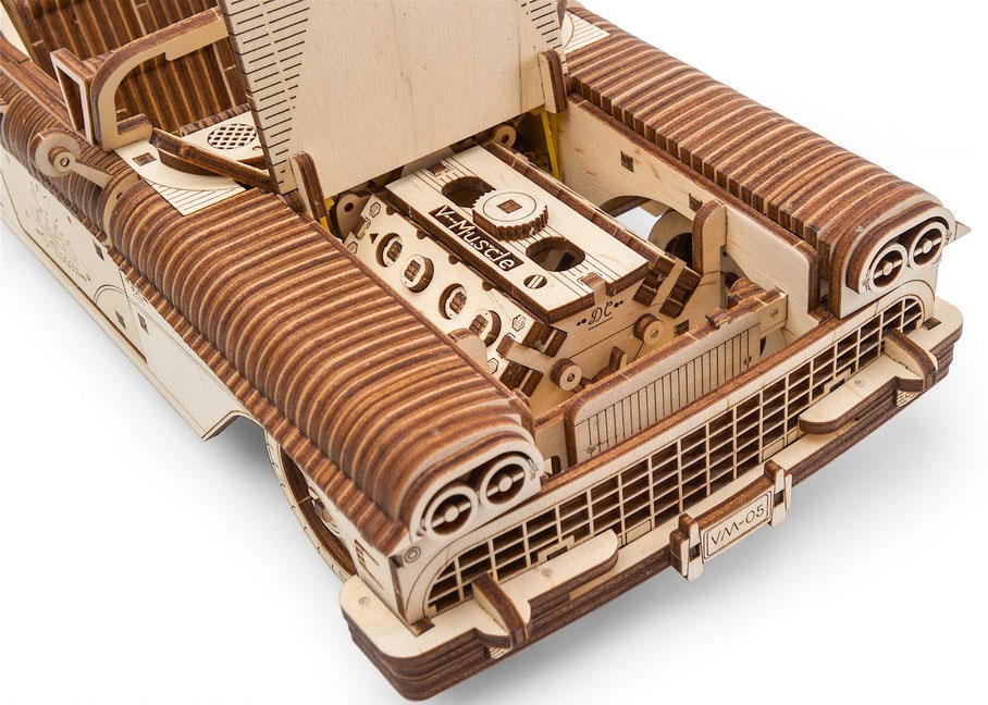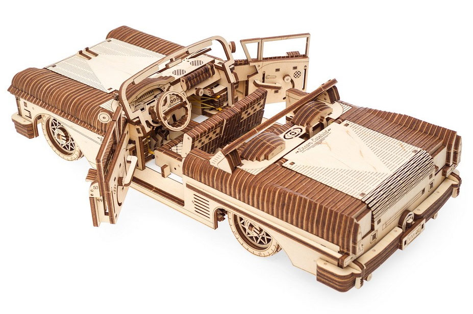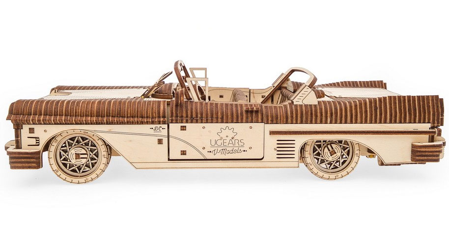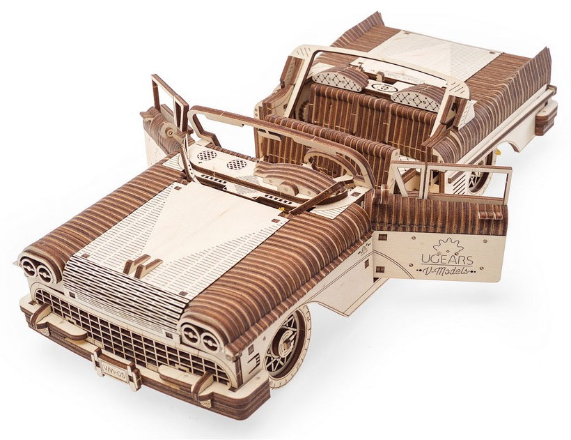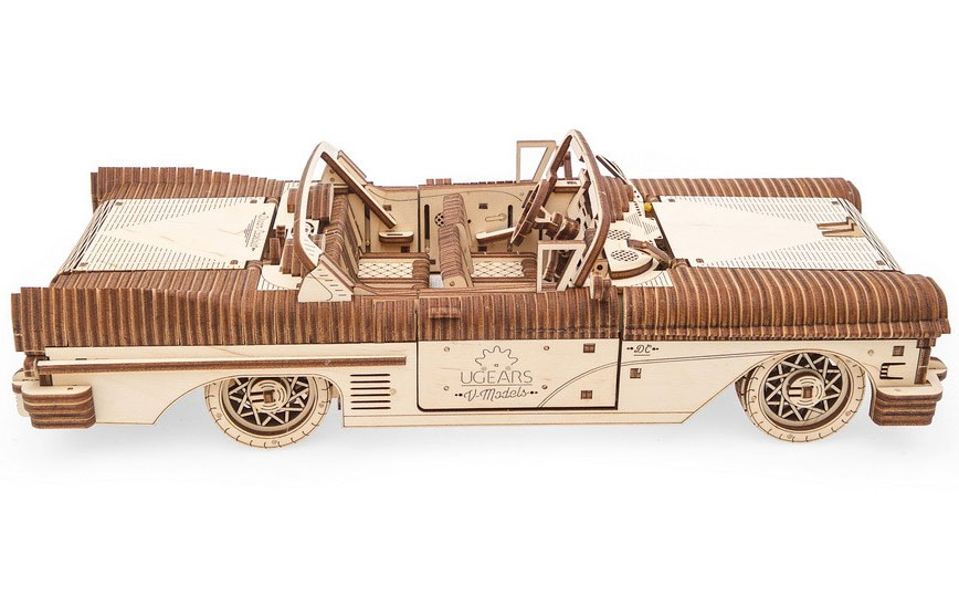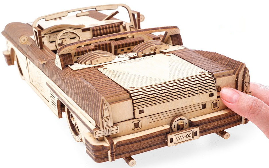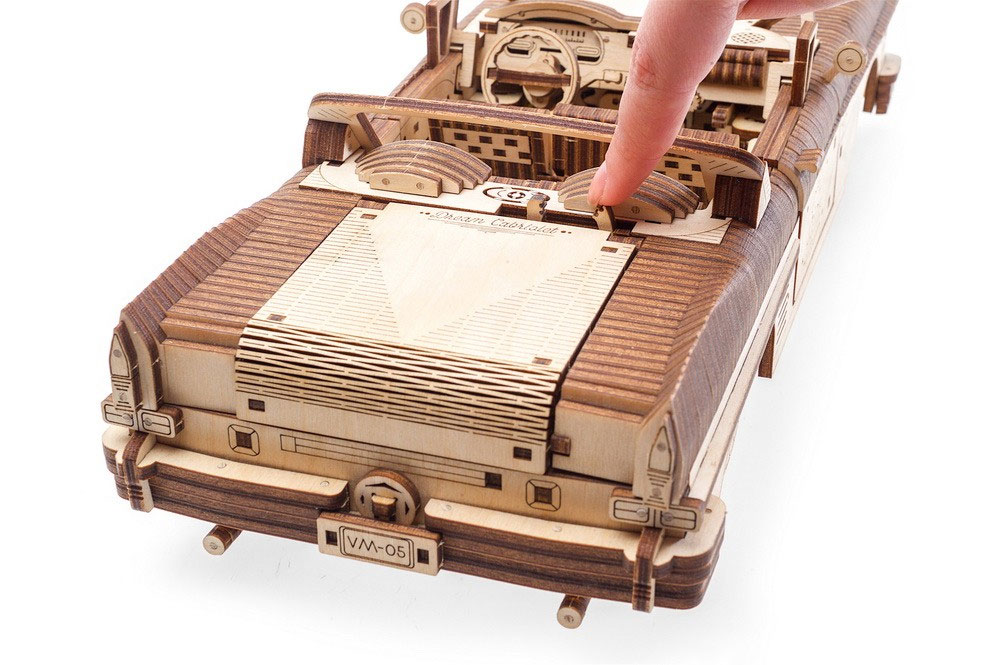 Mit dem Traum Cabriolet VM-05 von Ugears erscheint ein weiteres Modell aus der VM-Serie. Das Traum Cabriolet VM-05 besteht aus 739 Teilen und ist mit einem Gummibandantrieb ausgestattet, der das Auto selbstständig fahren läßt. Das Cabriolet kann sich vorwärts oder rückwärts bewegen. Damit Sie sich den schönen 8-Zylinder-V-Motor im Betrieb genau ansehen können, wurde der Leerlaufmodus eingeführt. In diesem Modus bleibt das Cabriolet geparkt und lässt Sie unter die Haube schauen. Über den Getriebehebel an der Lenksäule wird die Fahrtrichtung eingestellt. Sowohl Vorder- als auch Hinterräder des Modells sind gefedert. Weitere mechanische Merkmale sind der Kofferraum- und Haubenöffnungsmechanismen, die diesem hochdetailliertem Oldtimer eine gewisse zusätzliche Lebendigkeit verleihen.