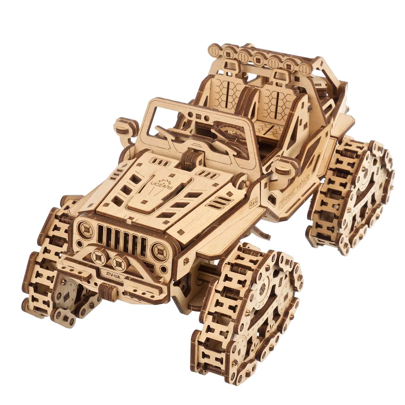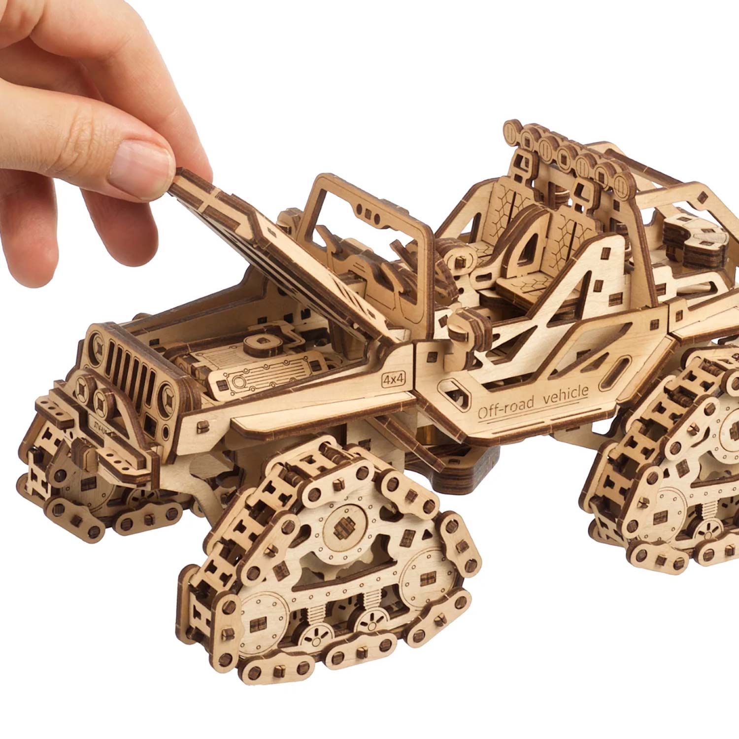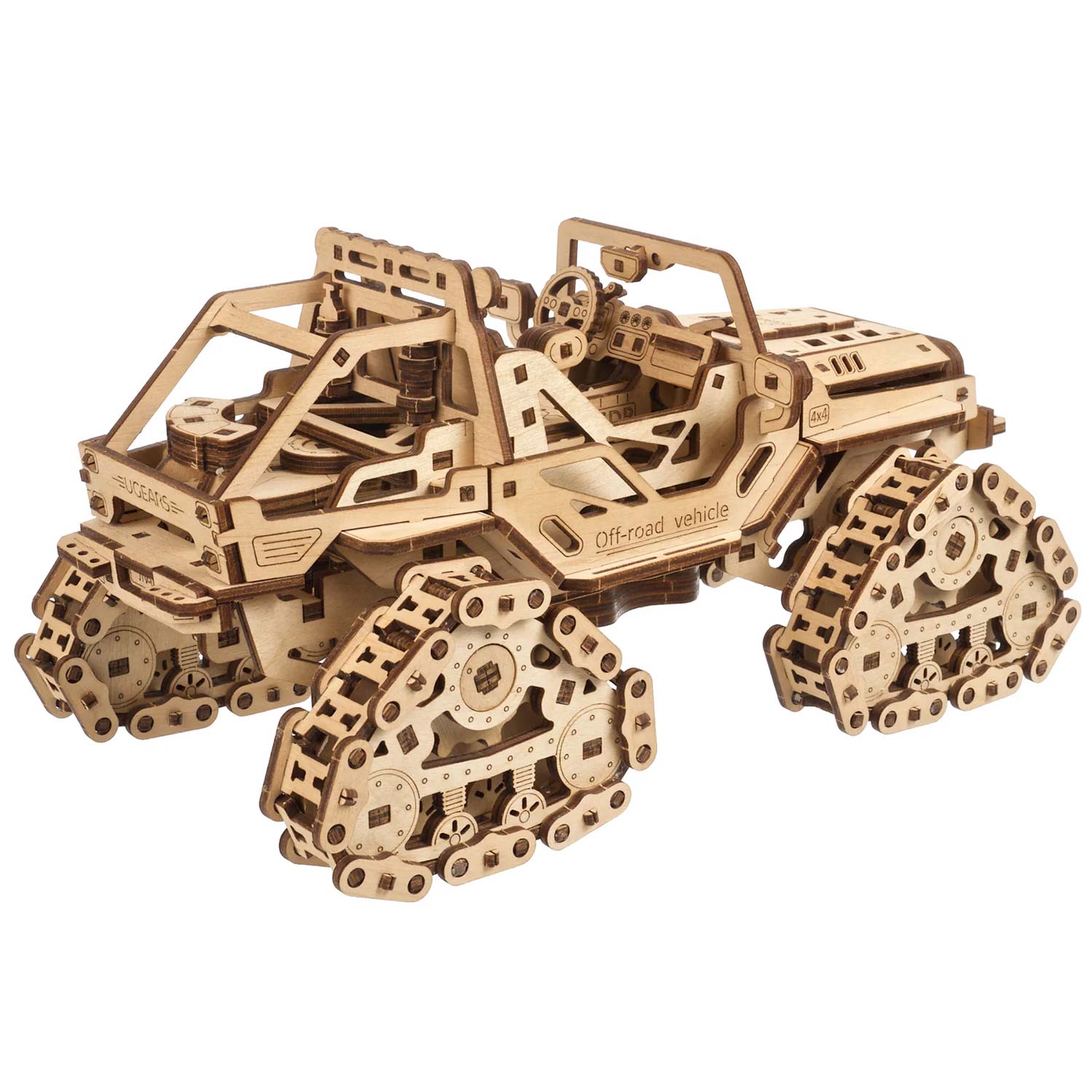 Der Raupen-Geländewagen von Ugears ist ein atemberaubendes Rock-Hopping-Fahrrad, das das Herz zum Stillstand bringt. Was auch immer Ihr 4x4-Geländewagen Ihrer Wahl ist, ob Sie ein UTV für die Jagd oder zur Fortbewegung auf der Farm, ein Sport-ATV für aufregende Trail-Abenteuer, einen Side-by-Side für Familienausflüge auf dem Land oder einen Dünenbuggy verwenden, um zu Ihrer Lieblingsbrandung zu gelangen oder ein Lastwagen für Arbeit und Abenteuer, nur ein Blick auf die Schienen dieses hölzernen Jeep-Modells löst Ihr "Ich will!" Reflex.