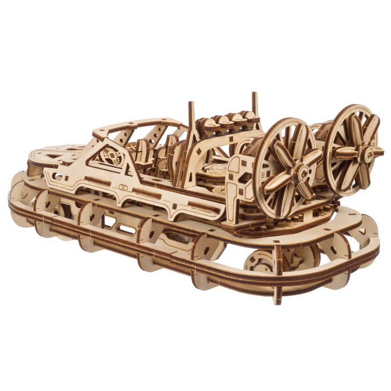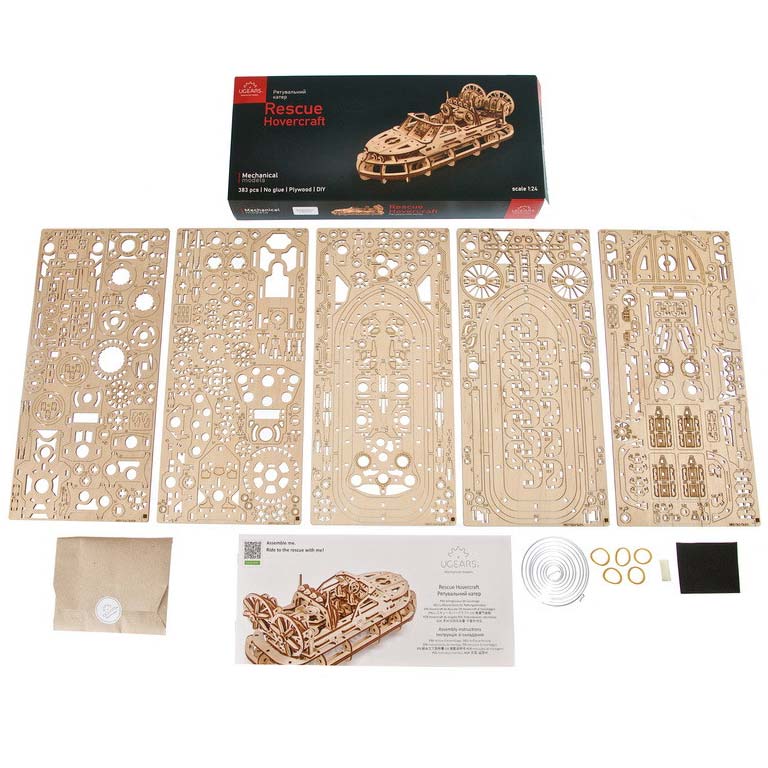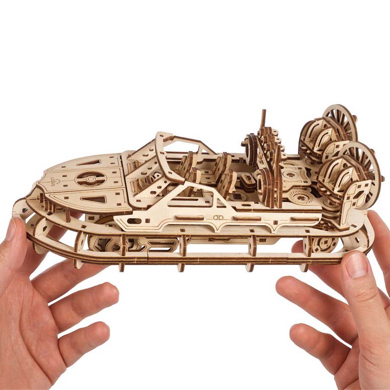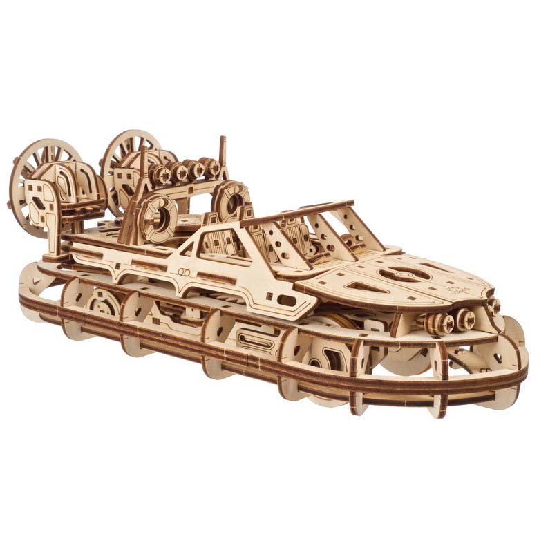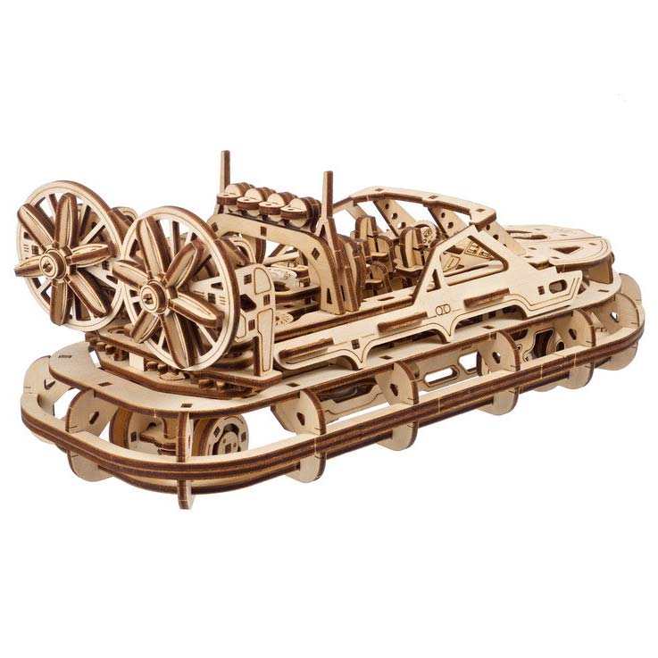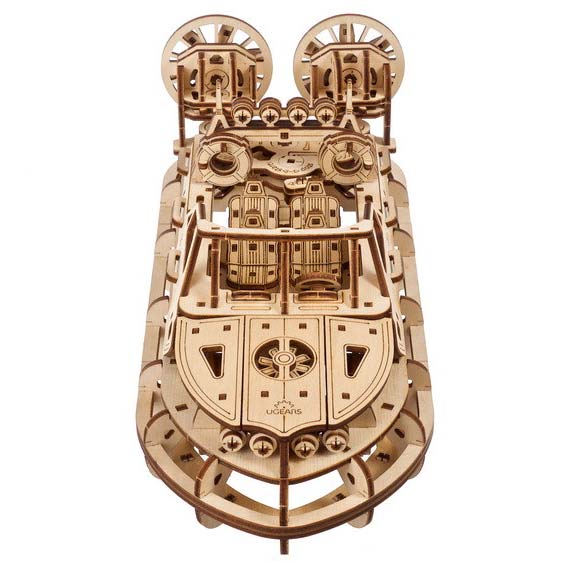 Unglaubliche Wirklichkeitstreue, cleveres Design und Liebe zum Detail sind das Markenzeichen der Ugears-Modelle. Das Luftkissenboot für Rettungseinsätze hat eine weite Luftkissenschürze, ein bewegliches handbetriebenes Hubgebläse am Bug, lasergravierte Hubgebläse am Heck, zwei große motorbetriebene Schubventilatoren, Lenkrad und Kabine mit vier Sitzen, zwei montierte Rettungsringe, am Bug installierte Scheinwerfer und am hinteren Teil der Kabine montierte Suchscheinwerfer für nächtliche Rettungseinsätze.