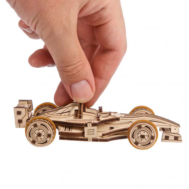 Der Bausatz Compact Racer von Ugears hat einen eleganten aerodynamischen Stil mit Front- und Heckflügeln, der ihm das Aussehen eines wirklichen Spitzenrennwagens verleiht. Die einsitzige offene Kabine und das offene Design der Räder zeigen bereits, dass es sich hier um den Schnellsten der Schnellen handelt. Wenn man den Compact Rennwagen von Ugears auf einer ebenen Fläche anstößt, rollt er und bewegt sich problemlos vorwärts. Außerdem hat er griffige gummierte Reifen für die Kurven. Dank seiner kompakten Größe kann man ihn für Rennabenteuer bei einem Freund oder auf dem Spielplatz bequem in die Jackentasche stecken.