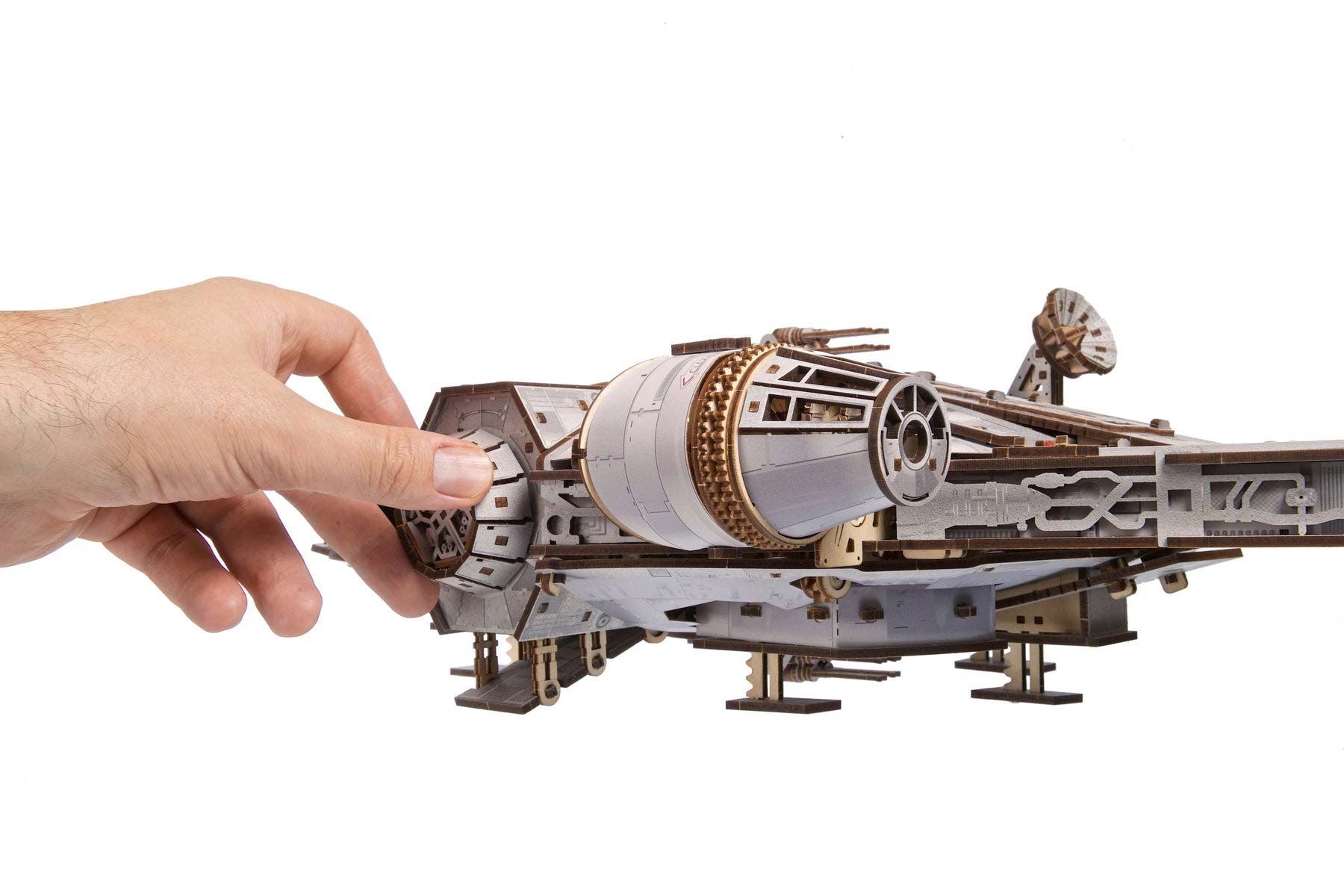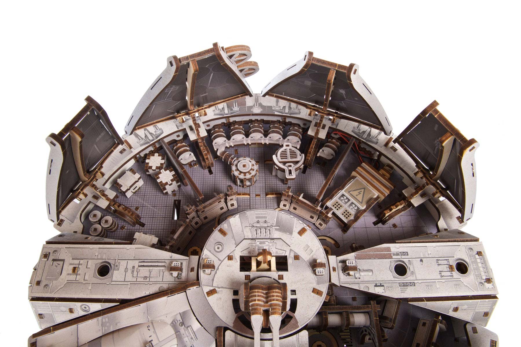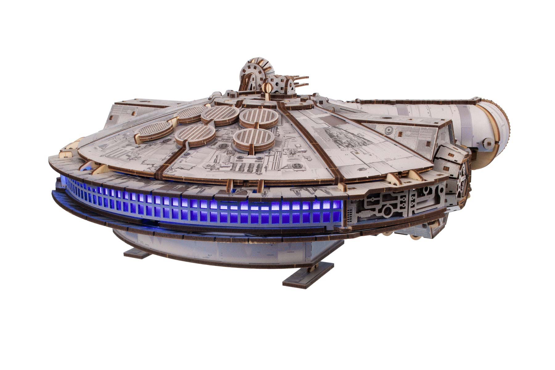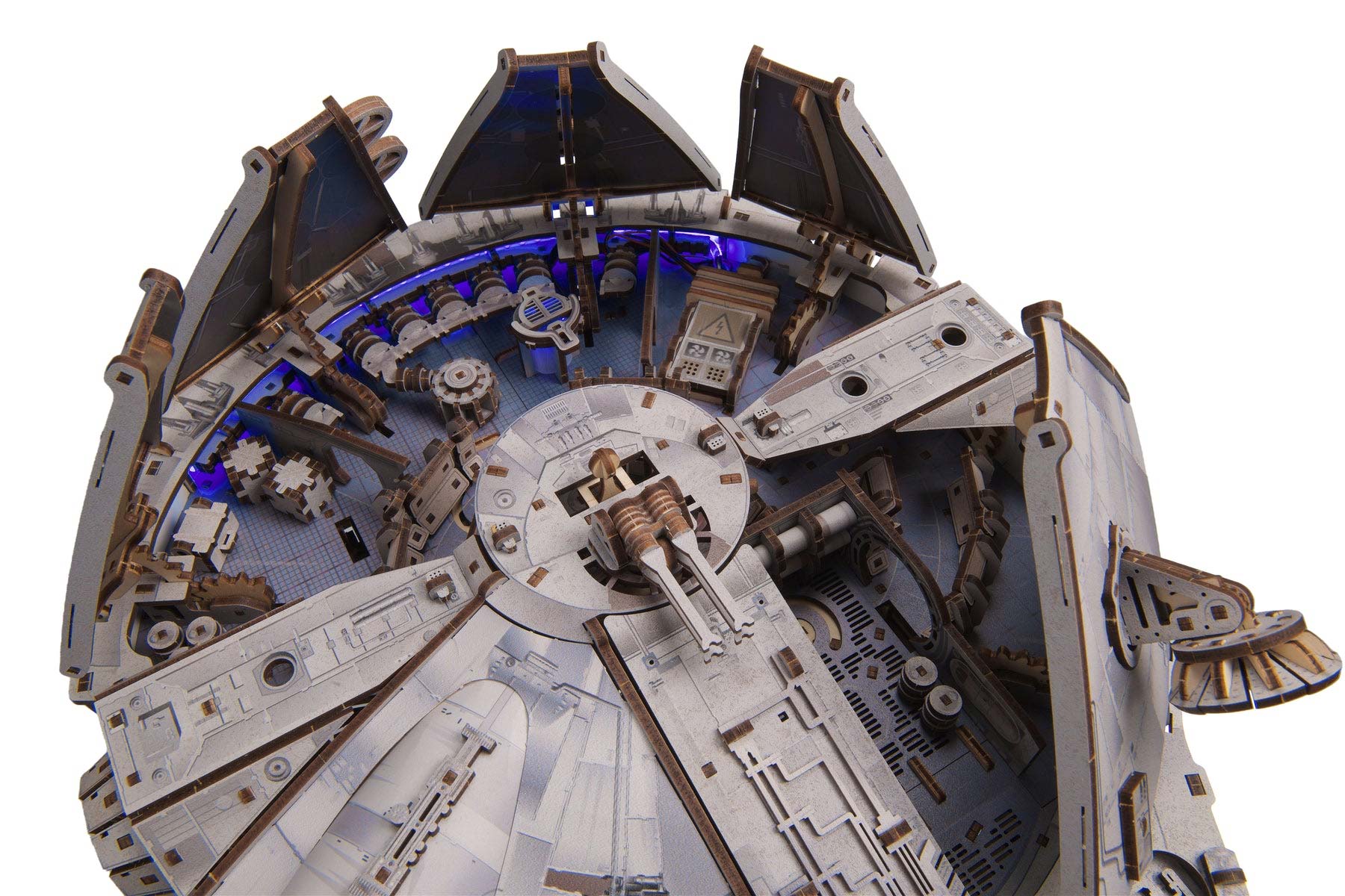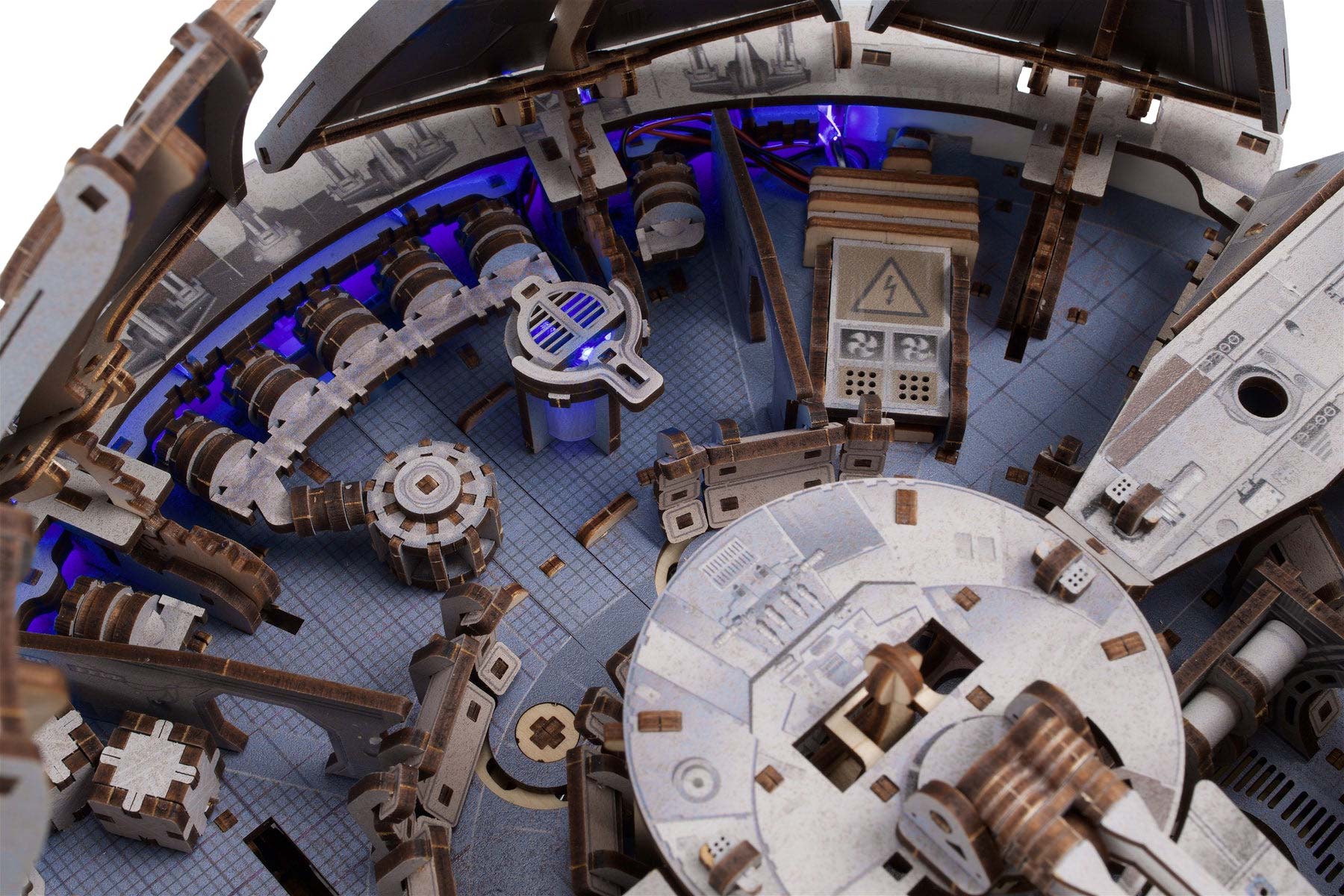Der Millennium Falke umfasst sowohl außen als auch innen farbige Elemente mit beeindruckenden Details, die das Aussehen des Schiffs in den Star Wars Filmen nachempfinden, sowie batteriebetriebene blaue LEDs, die das Leuchten des Hyperantriebs simulieren. Zu den beweglichen Elementen gehören die Einstiegsrampe, die Tür des Laderaums, das Fahrwerk, Geschütztürme, eine um 360º schwenkbare Antenne, ein aufklappbares Dach, das den Blick auf die beeindruckend realistischen Details im Innern freigibt. Hochdichte Elemente aus Holzfaser und Karton garantieren zusätzliche Haltbarkeit und Spannung. Bauen Sie Ihr eigenes Stück Filmgeschichte mit dem absolut aufsehenerregenden 3D Modell Millennium Falke.