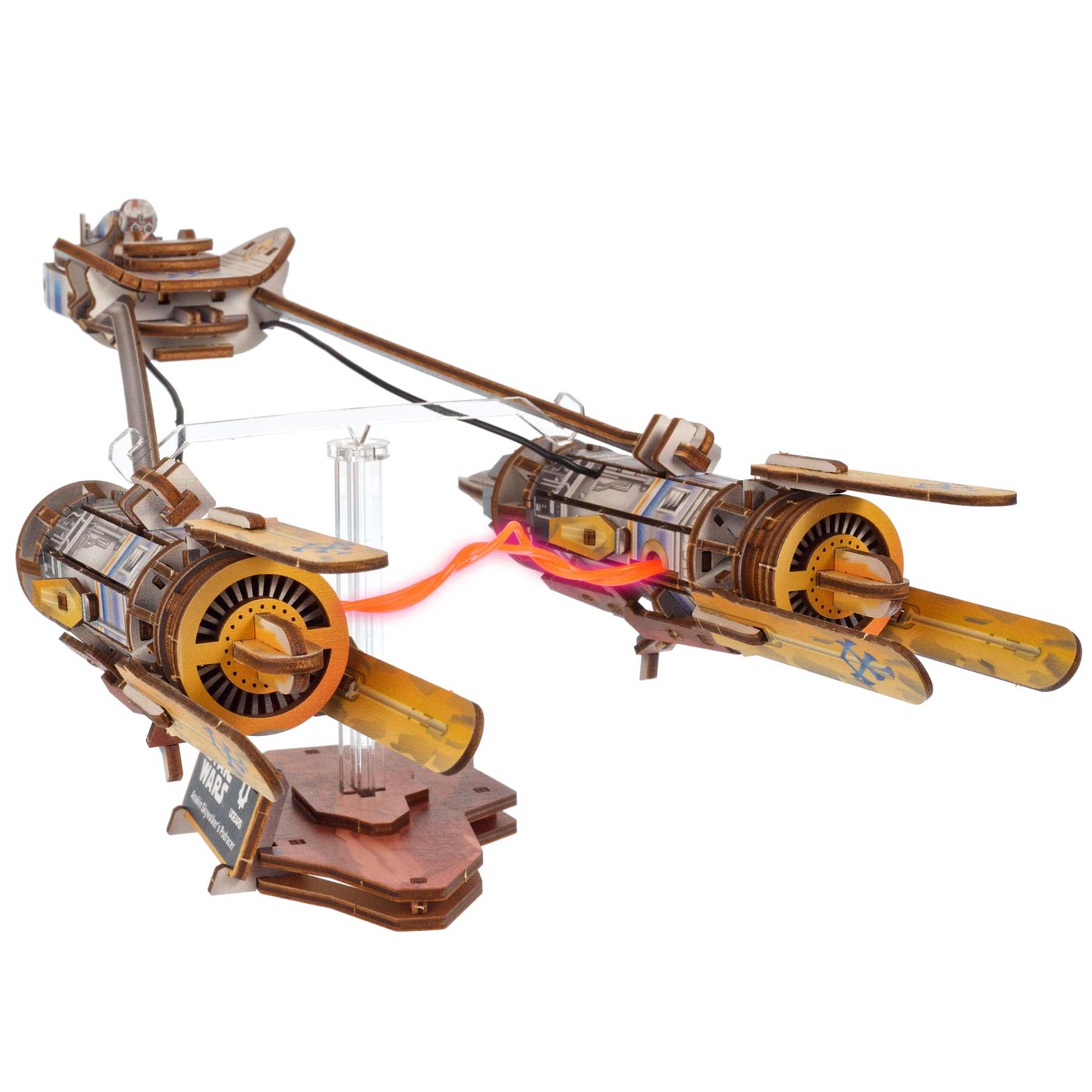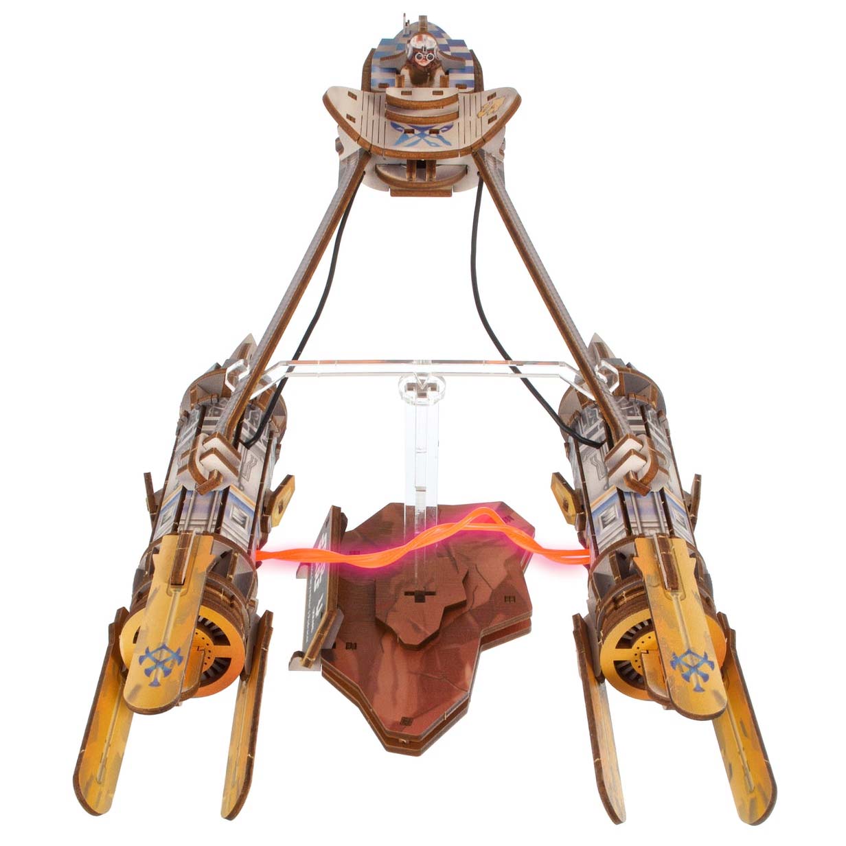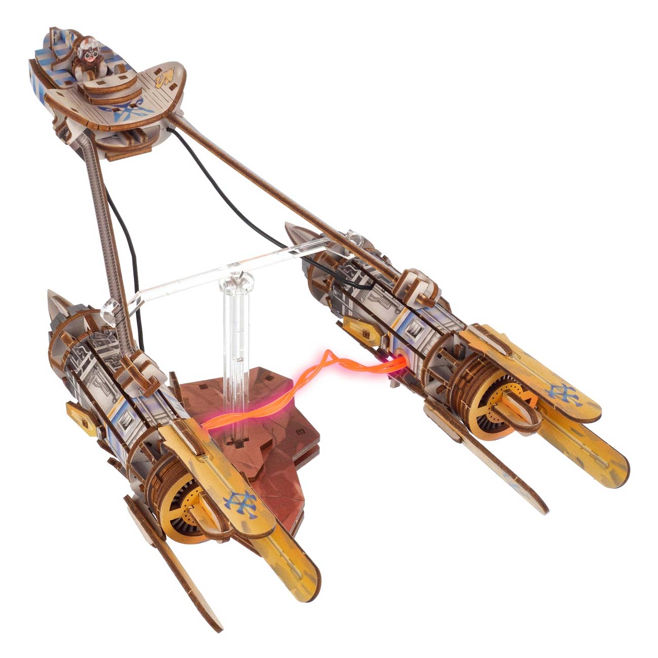 Anakin Skywalkers Podracer von Ugears fängt die Spannung des Podracings ein mit einem einzigartigen Balanciermechanismus, der das Fahrzeug kippen, schwanken und wenden lässt und so den schwebenden Flug simuliert. Anakin Skywalker sitzt im Cockpit, deren Seitentür manuell geöffnet werden kann. Die beiden Triebwerke sind über flexible, batteriebetriebene LED-Kabel miteinander verbunden und erzeugen den charakteristischen elektrischen Lichtbogen aus dem Film. Um das Licht zu aktivieren, genügt ein Schalter unterhalb der Triebwerke und der Lichtbogen erwacht zum Leben. Sollte die Batterie leer sein, kein Problem: Das Batteriefach lässt sich einfach aus dem Modell herausnehmen und ersetzen.
