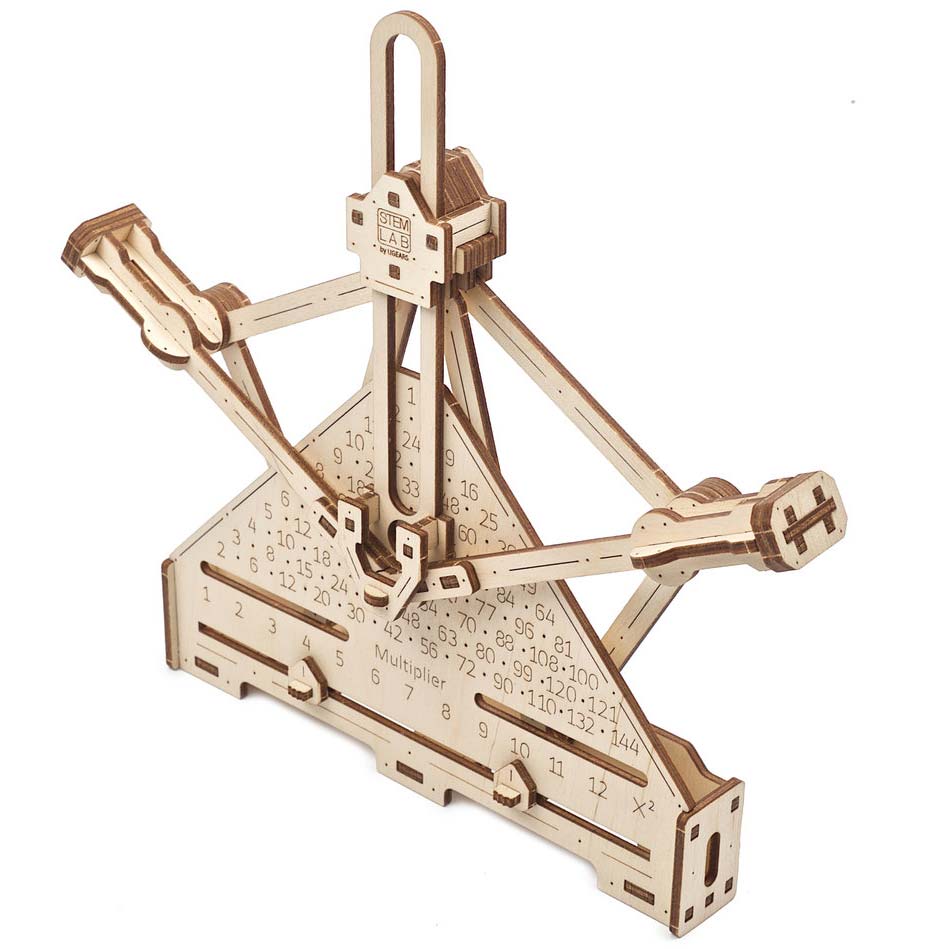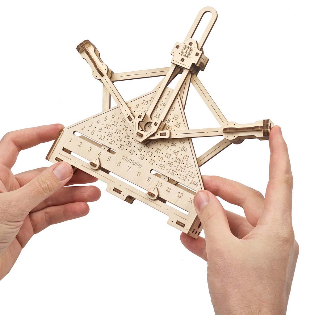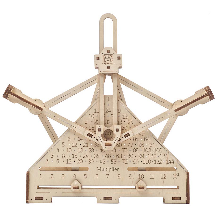 Der Mechanische Zahlenschieber von Ugears ist eine kompakte Rechenmaschine (oder Additionsmaschine), die mit Schienen funktioniert, die mithilfe eines mitgelieferten Stifts bewegt werden. Durch Verschieben der beweglichen Schienen, die mit Pfeilen und Ziffern von 0 bis 9 markiert sind, können Sie Zahlen addieren und subtrahieren. Der Mechanische Multiplizierer ist ein flacher Klappmechanismus, mit dem binäre Operationen mit Zahlen ausgeführt werden können. Durch Bewegen der beiden Griffstücke können Sie Multiplikationen und Quadratzahlenberechnungen von 1 bis 12 vornehmen. Damit wird das Einmaleins zum Vergnügen.