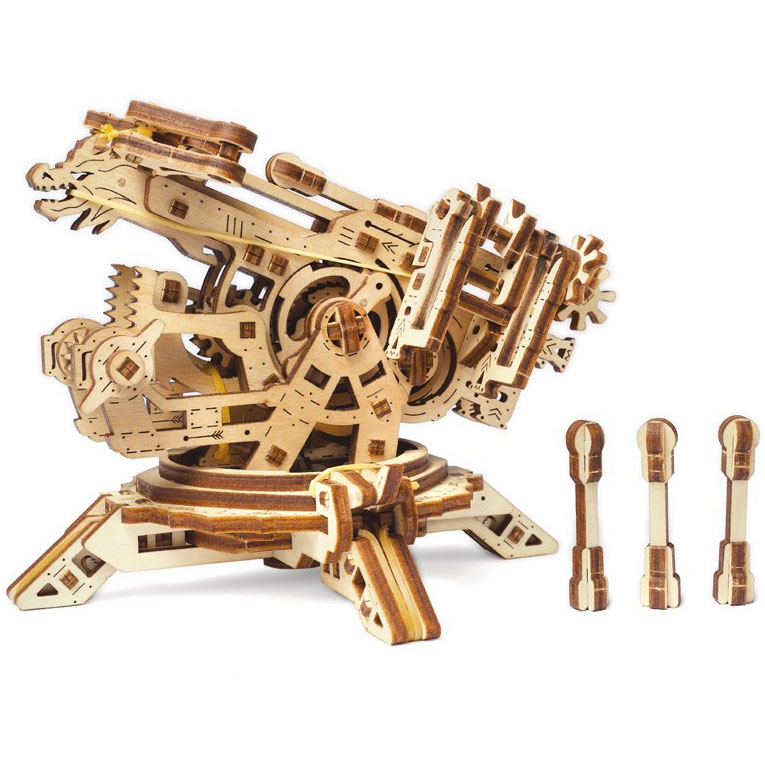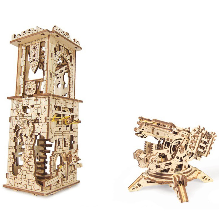 Die Ugears Archballista mit Turm stellt eine mittelalterliche Waffe der Artillerie nach. Das Modell besteht aus zwei Teilen: Der Belagerungsmaschine selbstr und dem mechanischen Turm. Beide Elemente sind beweglich: Die Basis der Archballista verfügt über verstellbare Beine und kann Holzbolzen verschießen. Dabei kann der mechanische Zündmechanismus bis zu 4 Elemente in einer Runde verschießen. Außerdem kann die Ballista vertikal und horizontal eingestellt werden. Das Zahnrad an der Seite des Turms ist ein Teil des Mechanismus, der die zweite Ebene hebt und die Wendeltreppe und die innere Struktur freilegt. Der Turm ist vollständig ausgefahren, wenn man den gesamten Schild mit einem Drachen sehen kann, der parallel zur Turmwand steht. Den oberen Teil der Ballista kann man auf das Dach des Turmes montieren.