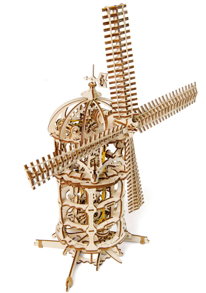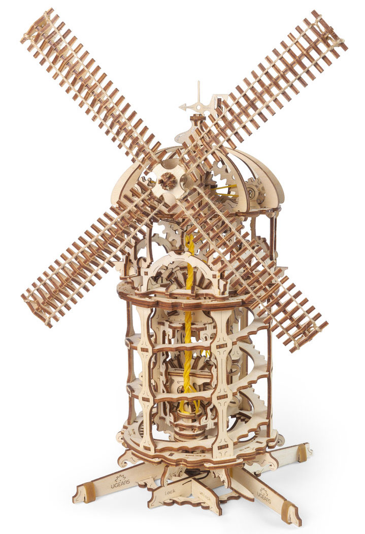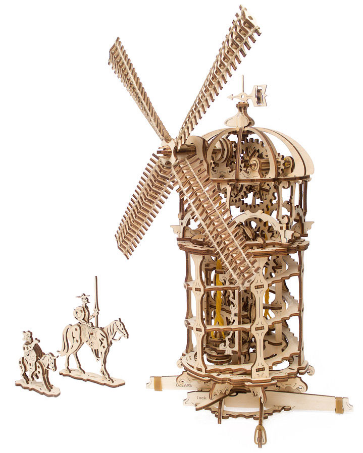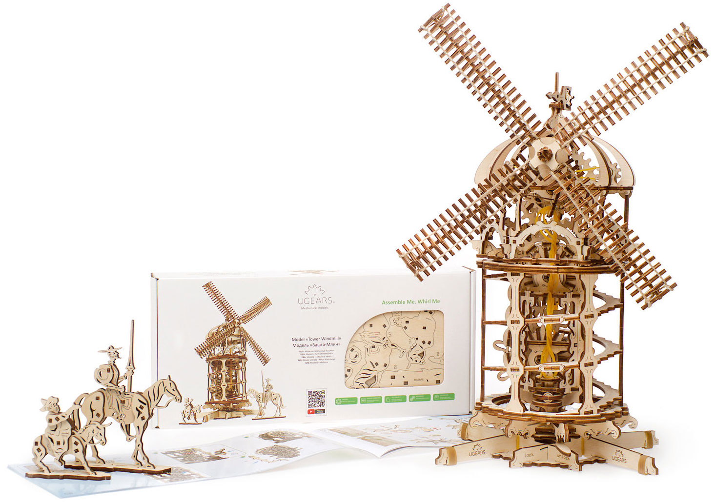 Die Ugears Windmühle ist mehr als ein einfacher mechanischer Bausatz. Das Modell ist wie eine Zeitreise in die Geschichte des alten Englands und wurde im Stil des Viktorianischen Steampunk designt. Die Mühle stellt ein Ebenbild der Chesterton Windmühle dar, welche aus dem 17. Jahrhundert stammt. Sobald sich die aerodynamischen Flügel der Windmühle anfangen zu drehen, entsteht ein ziemlich starker Wind. Andersrum sorgt auch der Wind dafür, dass sich die vier Flügel in Bewegung setzen. Nutzen Sie einfach einen kleinen Ventilator oder alternativ einen Fächer, um Kindern die Funktionsweise der Mühle zu demonstrieren. Die doppelte Schaltung mit verschieden geformten Zahnrädern sorgt für die nötige Geschwindigkeit. Angetrieben wird das Modell von einem Aufziehmotor. Entfernt man den Motor, so funktioniert die Windmühle auch manuell und der komplexe Mechanismus wird bis ins Detail sichtbar. Der Motor setzt die Flügel mit Hilfe eines aufgedrehten Bandes und des Zahnradgetriebes in Bewegung. Das Getriebe besteht aus einem gebogenen Gelenk, welches aus einer Reihe von vielen kleinen Bindegliedern besteht. Diesen eigenständigen Kettenantrieb aus Sperrholz gab es noch in keinem anderen Modell von Ugears zuvor. Ähnlich einer Wendeltreppe, ist der rotierende Bogensockel ein Teil des Aufziehmechanismus und somit das Herz des Mechanismus. Der Bausatz ist zusätzlich mit zwei spanischen Figuren bestückt: Dem tapferen Ritter Don Quichotte und dessen treuen Knappen Sancho Panza.
