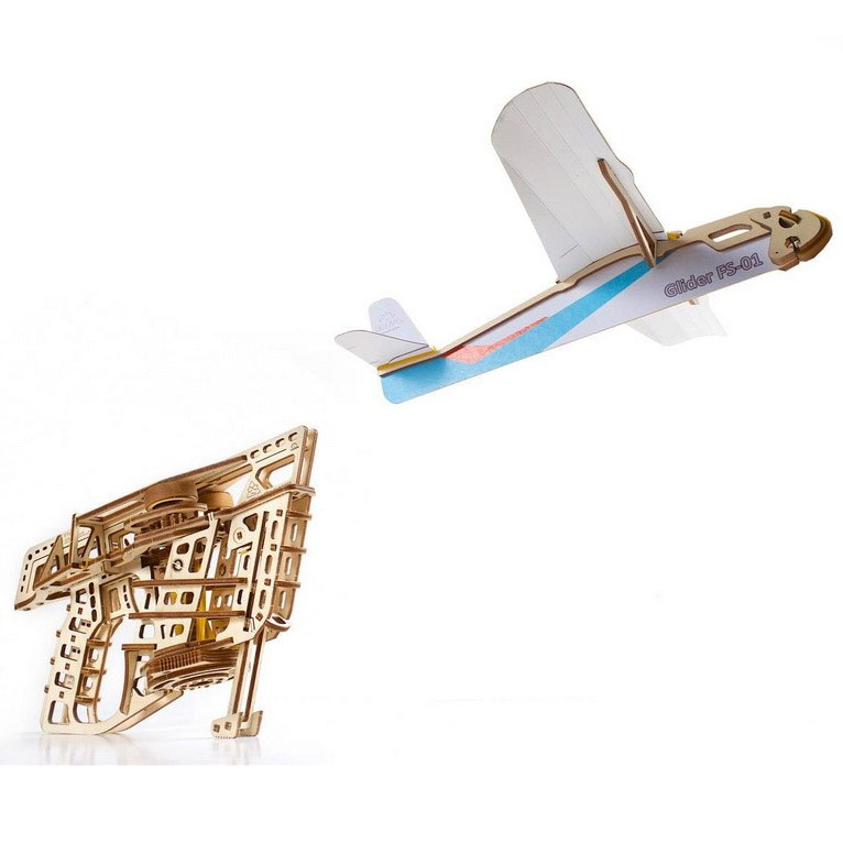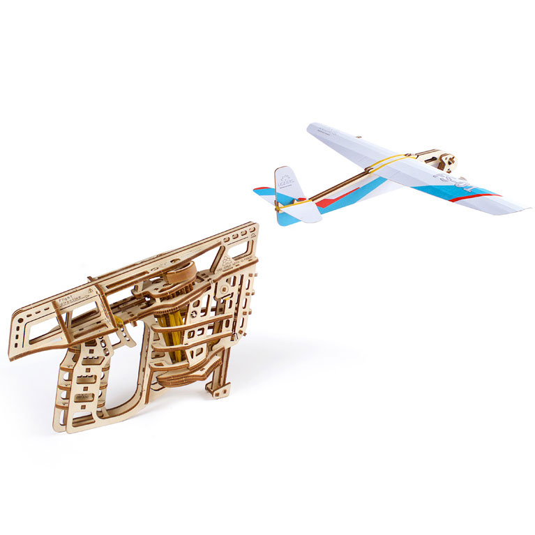 Der Flugzeugstarter von Ugears ist ein tragbares Handkatapult. Der mechanische Launcher ist für leicht fliegende Flugzeugmodelle geeignet, drei davon sind bereits im Bausatz enthalten. Der Starter ist mit einem Gummibandmotor ausgestattet, der eine gewisse Spannung bietet, damit Ihr Flugzeug beim Loslassen losfliegt. Der Auslöser hat ein Sicherheitsschloss. Die Spannung und damit die Distanz, die Ihr Flugzeug zurücklegen wird, werden durch die Aufziehmechanik gesteuert. Die Reichweite dieses neuen ballistischen Modells kann 30 Meter überschreiten - abhängig von den verwendeten Geschossen und wie starke es aufgezogen wurde. Der Vausatz beinhaltet neben dem Starter ein Segelflugzeug und zwei Papierflugzeuge.