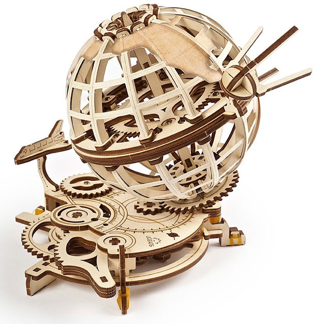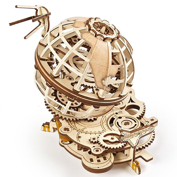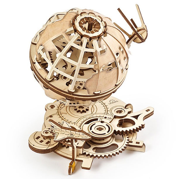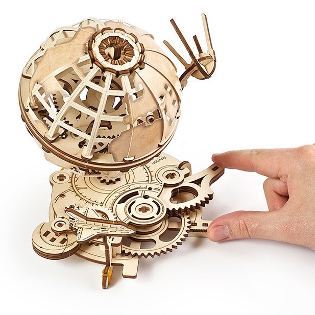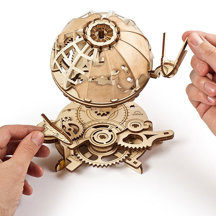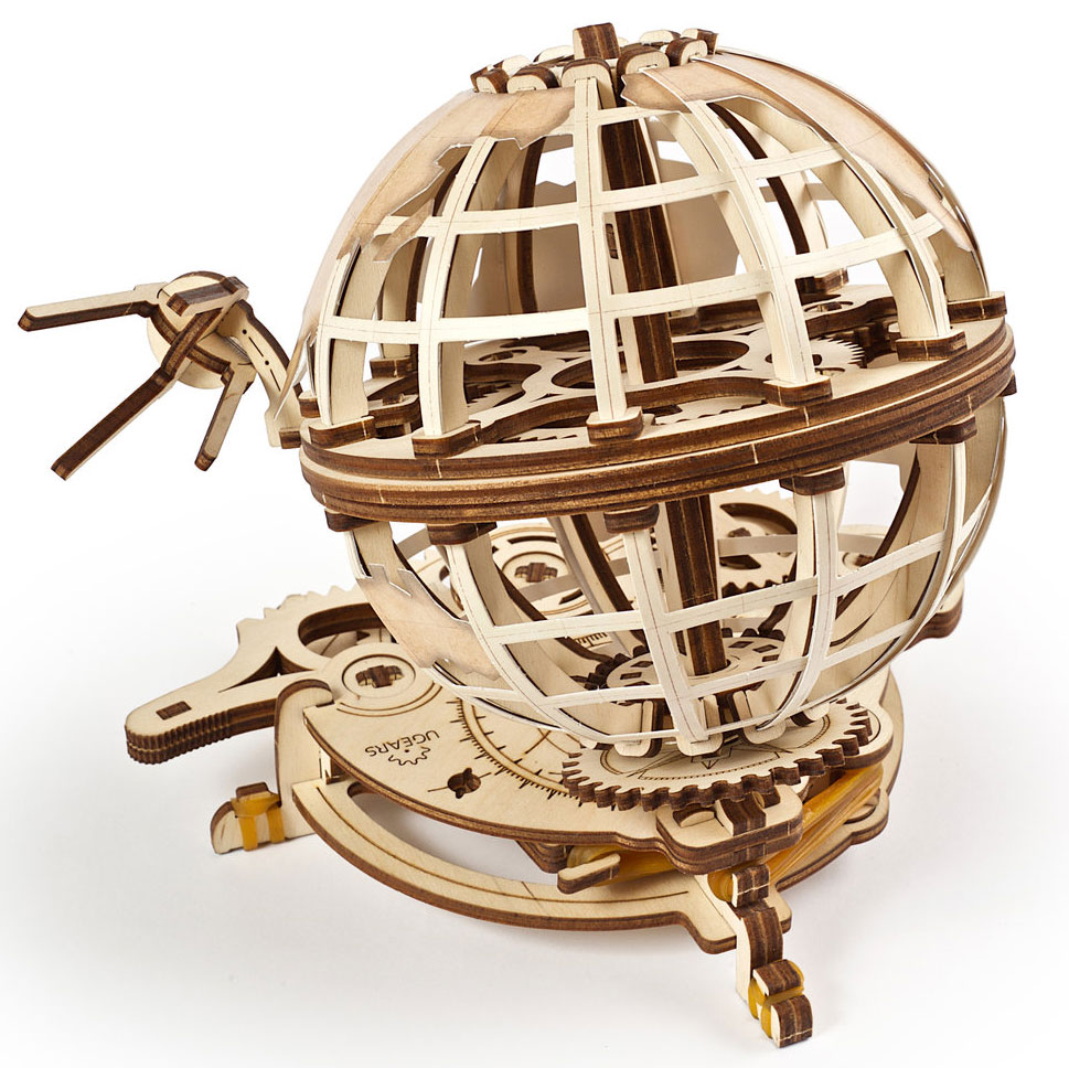 Der Ugears Globus ist ein ausgefeilter Bausatz der Erde mit einem rotierenden Mechanismus und kuriosen kleinen Extras, welches das Model umso interessanter machen. Das Hauptmodul des Models besteht aus zwei Teilen: der Globus sowie die Plattform des Mechanismus. Die Sphäre des Globus sitzt auf einer Achse, welche genauso geneigt ist wie die Achse unserer Erde. Wie die meisten Ugears Modelle ist auch dieser Globus beweglich durch einen Gummibandmotor. Der Mechanismus wird komplett in Gang gesetzt, wenn man den Hebel an der Grundfläche einmal komplett im Uhrzeigersinn dreht. Sobald man den Hebel loslässt, beginnen die Zahnräder ihre Arbeit. Wenn es langsamer rotieren soll, kann man den Globus per Hand drehen und zusehen, wie die Kontinente vorbeischweben. Zusätzlich zum Hauptmodul gibt es noch zwei weitere austauschbare Extra Module: das Shuttle und der Sputnik. Sie sind an das Hauptmodul gebunden durch die planetarischen Zahnräder und rotieren fast zwei Mal so schnell wie der Globus. Mit einem Ziehen des Aufzughebels rotieren sie fast zwei Mal ganz um die eigene Achse.