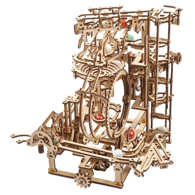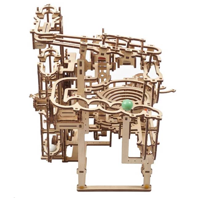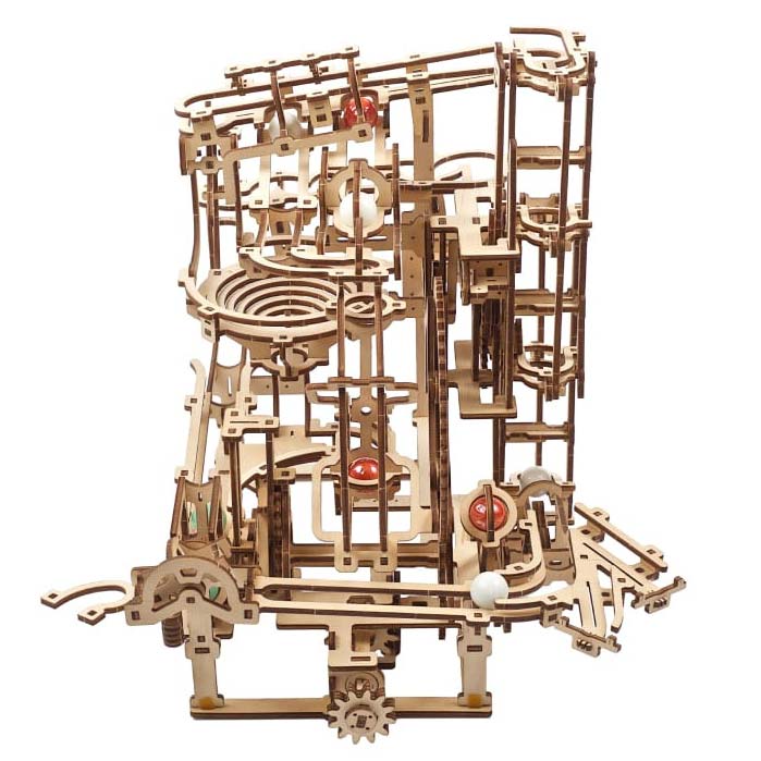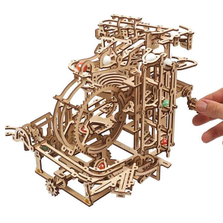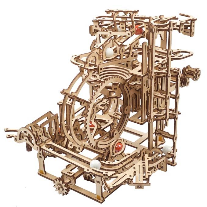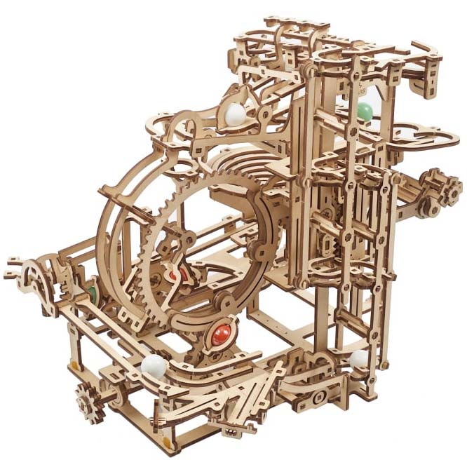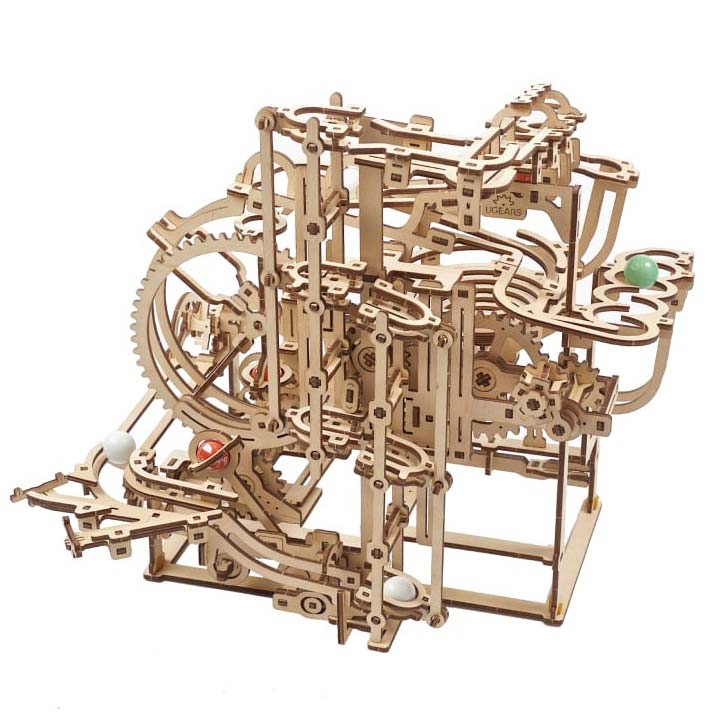 Das Modell verfügt über einen Hebemechanismus mit 3 Etappen, der die Murmeln vorwärts und rückwärts bewegt, während diese nach oben klettern, um sich in ihr Vergnügungspark-Abenteuer zu stürzen. Welche Murmel wird wohl welche Bahn hinunterrollen? Welche wird als erste unten sein? Die Murmel-Stufenbahn umfasst einen Sammelhalter für 3 Murmeln; die dritte Murmel öffnet dessen Türen für die dort festsitzenden beiden anderen, und alle drei werden auf ihre unterschiedlichen Bahnen geschickt. Es gibt drei Parcours: Der erste besteht aus einem Sammelhalter für 2 Murmeln und einer Serpentinenbahn, der zweite ist eine Überschlagschaukel in einem C-förmigen Rahmen und der dritte weist einen Trichter oder Wirbel auf. Schließlich durchlaufen alle Murmeln die Auffangplattform hin zu der Wippen-Hebevorrichtung. Ein Wippschalter-Mechanismus sendet die Murmeln entweder zurück entlang der Rücklaufbahn in Richtung der stufenförmigen Hebevorrichtung mit 3 Etappen oder (und hier beginnt es, richtig spannend zu werden!) in eine andere, mit dieser verbundene Murmelbahn von Ugears.