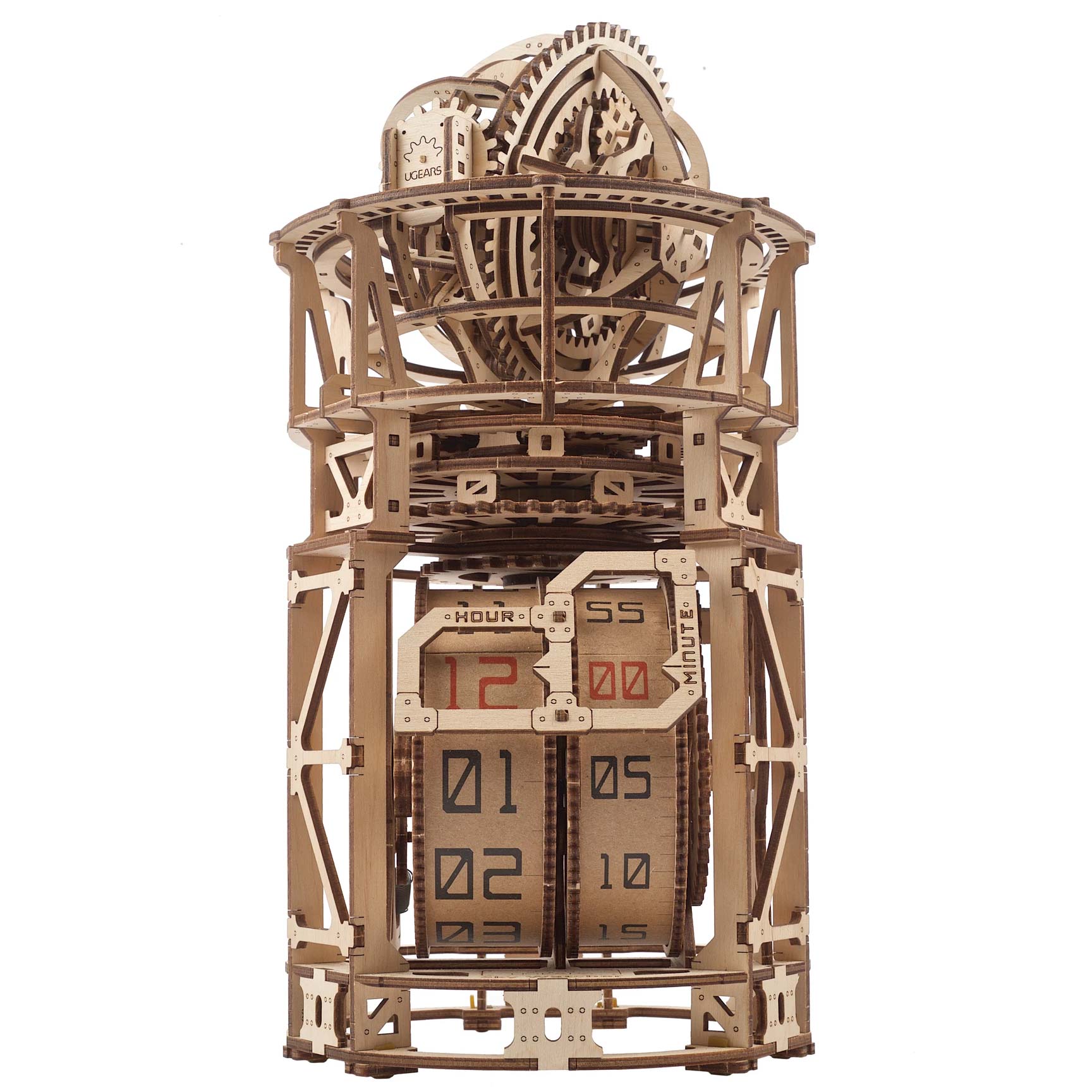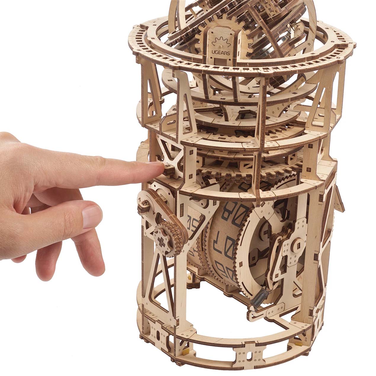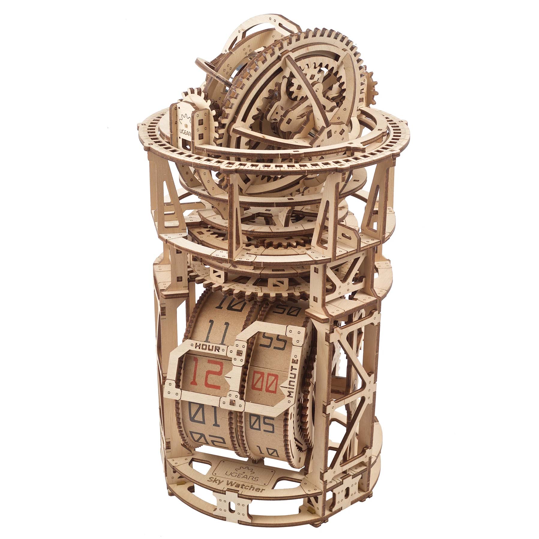 Die Tourbillon-Tischuhr Sternengucker von Ugears ist eine faszinierende Kombination aus fantasievollem astronomischem Observatorium und funktionaler Tischuhr! Besonders bemerkenswert an diesem funktionalen und wunderschönen Tischuhr-Holzmodell ist das sich drehende Tourbillon, das am oberen Teil angebracht ist. Bei Armband- und Taschenuhren hilft der Tourbillon-Mechanismus, deren Genauigkeit zu erhöhen, indem er den Auswirkungen der Schwerkraft entgegenwirkt, wenn sich die Uhr unbewegt in einer Position befindet. Indem Hemmungsrad und Unruh in einem sich drehenden Käfig angeordnet werden, werden durch die Schwerkraft hervorgerufene kleinere Gangabweichungen ausgeglichen.
