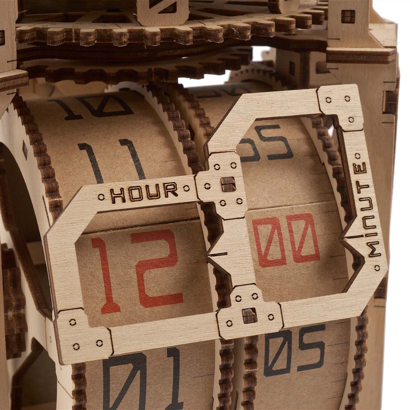 Der Ugears Sternengucker Tourbillon-Mechanismus hat drei Drehachsen: um die Vertikalachse der Uhr, die Horizontalachse der Uhr und im Verhältnis zur mittleren Achse der Innenkugel. Die aufziehbare Uhr funktioniert auf der Grundlage der Akkumulation potenzieller Energie in einer flachen Feder und der dosierten Freisetzung dieser Energie. Wenn das Modell vollkommen aufgezogen ist, wird der Zeitmesser rund 2-3 Stunden angetrieben. Das bietet ausreichend Zeit, um diesen faszinierenden Mechanismus eingehend zu betrachten oder um sich beim Arbeiten oder Ausruhen an dem angenehmen Ticktack im Hintergrund und dem schönen Anblick zu erfreuen. Im Gegensatz zu dem üblichen Ziffernblatt mit Zeigern haben wir einen weiteren interessanten Aspekt eingearbeitet, indem die Zeitanzeige auf Rollen erfolgt. Die Minuten-Rolle dreht sich langsam mit dem Fortschreiten des Tourbillons, während die Stunden-Rolle die vergehende Zeit mithilfe eines Schlagmechanismus markiert.