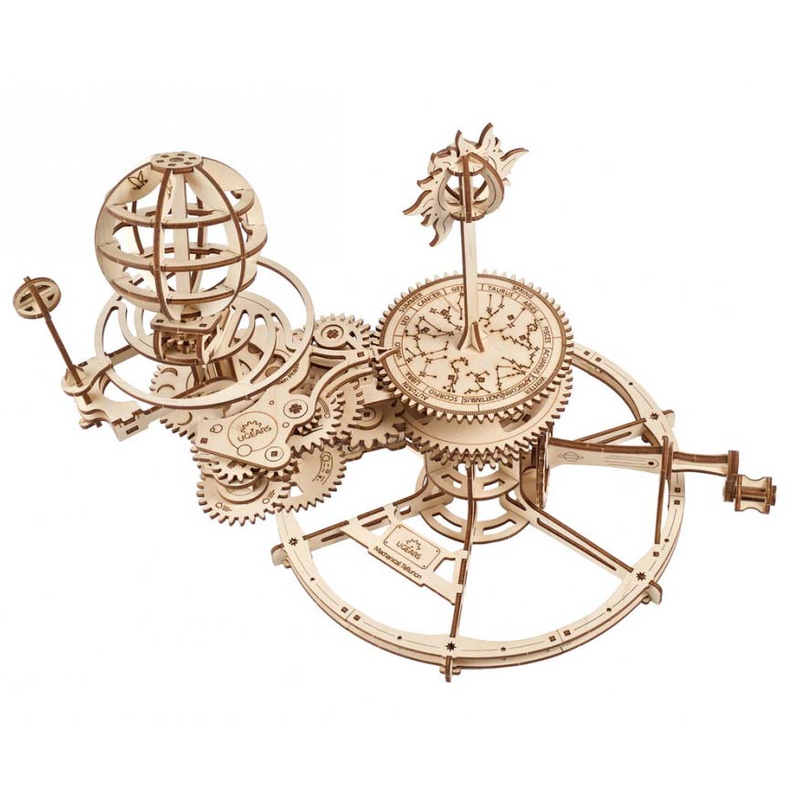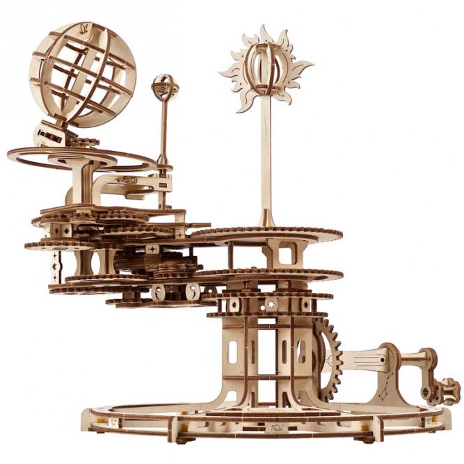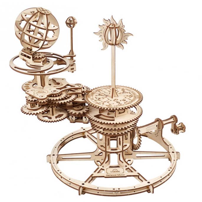 Das Mechanische Tellurium von Ugears, das in Form eines präzisen Holzmodells unseren kleinen Winkel im Universum darstellt. Ein Tellurium (manchmal auch Loxocosm genannt) ist ein genialer Mechanismus, der den kosmischen Tanz von Sonne, Erde und Mond veranschaulicht. Anhand der Bewegungen dieses 3D-Puzzles sieht und versteht man, warum es Tag und Nacht wird, wodurch die Mondphasen bedingt sind und warum sich die Jahreszeiten ändern. Ein Tellurium (aus dem Lateinischen, tellus, Erde) gleicht einem Orrery, das die relativen Positionen und Bewegungen der Planeten und Monde des Sonnensystems in einem heliozentrischen Modell darstellt.