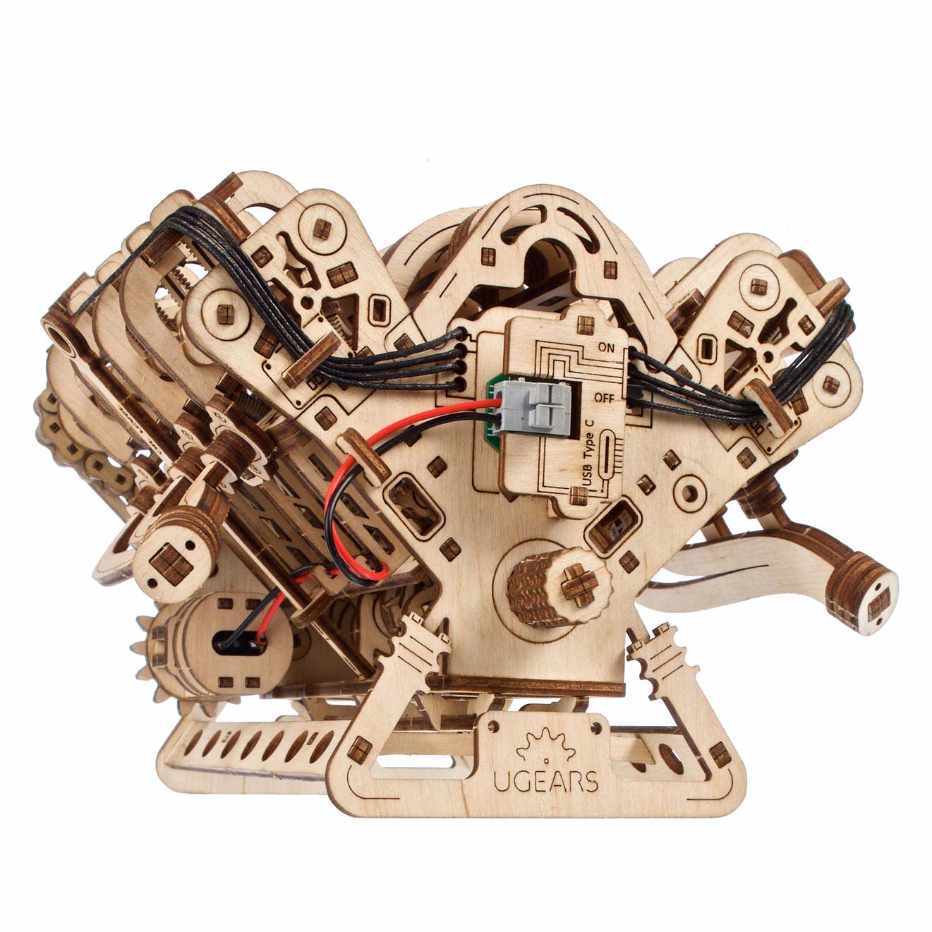 Der V8-Motor von Ugears ist ein Modell im Maßstab 1:6, das mit einem elektrischen Motor oder durch Drehen eines Knaufs betätigt werden kann und es Ihnen ermöglicht, die faszinierende Funktionsweise dieses emblematischen Verbrennungsmotors zu beobachten. Das Modell bildet alle wichtigen Mechanismen eines wirklichen V8-Motors komplett nach; dazu gehören die acht Zylinder mit sich im Kreis bewegenden Kolben (wobei zwei Zylinder alle 90 Grad der Kurbelwellendrehung zünden), die sich durch den Druck der Nocken der sich drehenden Nockenwellen öffnenden und schließenden 16 federbelasteten Ventile, das Kurbelgehäuse und die mit einer Steuerkette verbundenen Komponenten des Ventiltriebs, sowie eine Drosselklappe am Ansaugstutzen. Das Modell wird mithilfe eines als Generator ausgeführten elektrischen Motors angetrieben. Ein Keilrippenriemen verbindet die Kurbelwellenriemenscheibe mit mehreren Scheiben, die Motorzubehör darstellen, wie der Kompressor für Motorkühlung, Lichtmaschine, Servopumpe und Kühlwasserpumpe. Schließen Sie das Modell mittels eines USB-C Kabels an die Stromversorgung und stellen Sie dann den Start-/Stopp-Schalter auf On, um Ihren Motor zum Leben zu erwecken. Oder aktivieren Sie den V8-Motor per Hand, indem Sie den Knauf unterhalb des Start-/Stopp-Schalters betätigen.