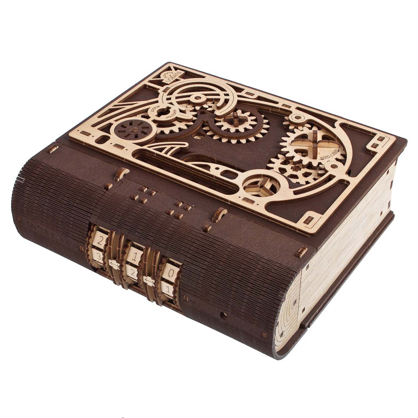 Der Bausatz Buch der Gehemnisse von Ugears: Schließen Sie geheime Notizen, wertvolle Schätze oder andere persönliche Dinge mit dem Buch der Geheimnisse einfach weg und halten Sie sie von neugierigen Blicken fern. Dieses wunderbare 3D-Holzpuzzle ist eine Steampunk-Schatulle in Form eines Buches mit Zahlenkombinationsschloss, einem Geheimfach, einem Öffnungsprozess in mehreren Schritten und einer fantastische Mechanik. Ihr Buch der Geheimnisse öffnen Sie, indem Sie eine dreistellige Zahlenkombination in den Buchrücken eingeben, damit der Geheimschlüssel entsichert wird. Stecken Sie den Schlüssel in den speziellen Schlitz und drehen Sie ihn gegen den Uhrzeigersinn, damit der Öffnungsmechanismus aktiviert wird. Dann drehen Sie die Zahnräder ebenfalls gegen den Uhrzeigersinn und öffnen schließlich das Buch. Mehrere Fenster auf der Schatulle zeigen Ihnen, ob Sie die einzelnen Schritte korrekt ausgeführt haben. Diese mechanische 3D-Geheimschatulle mit seiner komplexen Öffnungsabfolge steckt voller Mysterien und ist sowohl eine lustige Art, Dinge aufzubewahren, als auch ein lustiges Spiel, bei dem Sie Freunde und Verwandte herausfordern können, die Rätsel des Buchs der Geheimnisse zu lösen. Zum ersten Mal in der Geschichte von Ugears haben wir zwei Farben von Sperrholz (dunkel und hell) verwendet, um dieses Modell für Sie noch spezieller zu machen.