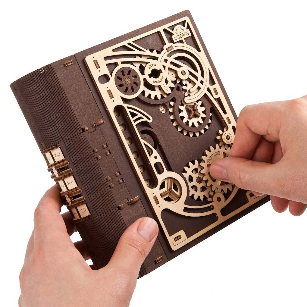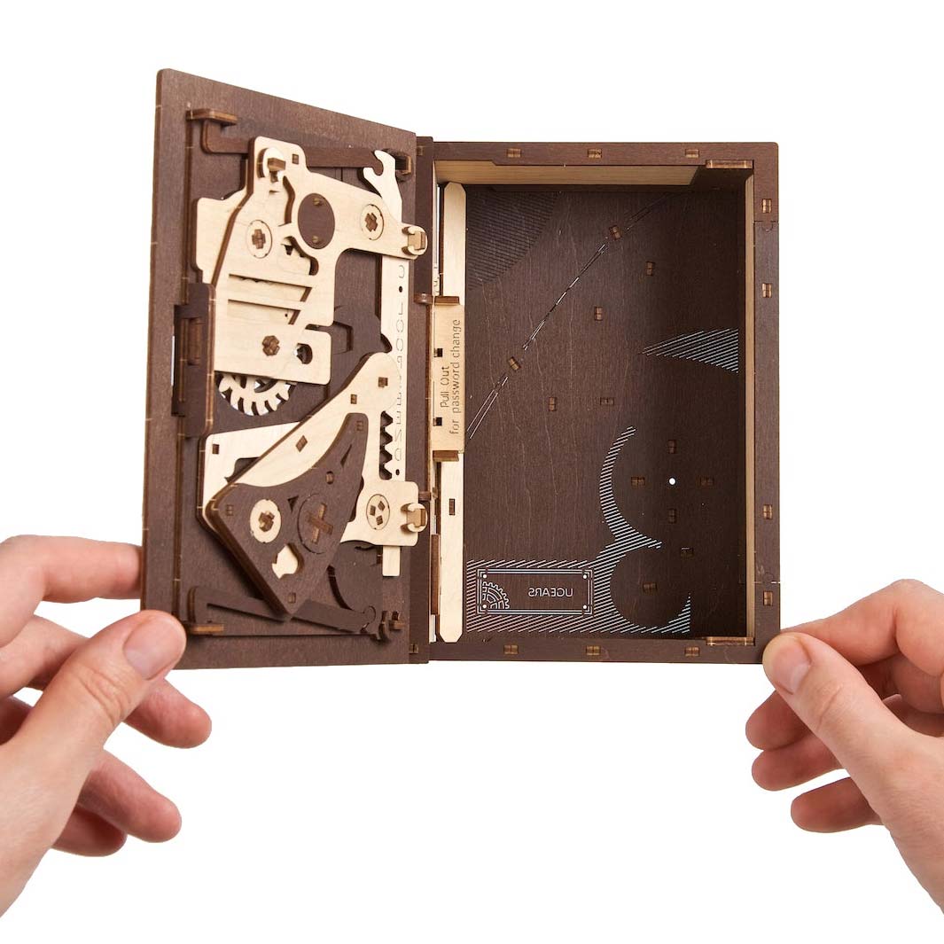 Praktisch seit ihrer Erfindung werden Bücher verwendet, um Dinge darin zu verstecken, sowohl in der Realität als auch in der Fiktion. Wohnungsbesitzer können Wertsachen vor Dieben verstecken, indem sie ein Buch aushöhlen und es anschließend zusammen mit anderen Bänden zurück ins Regal stellen. Die Wohnungsbesitzer werden das geheime Buch schnell wiederfinden, für den Einbrecher dagegen ist es praktisch unmöglich. In dem Film Matrix versteckt Neo Disketten und Bargeld in einem Buch. Und wer erinnert sich nicht an jenen Gefängnisausbruch in Die Verurteilten, der mithilfe eines Geologenhammers ausgeführt wurde, der in einer Bibel versteckt war, die dafür ab dem Buch Exodus ausgehöhlt worden war. Wir alle lieben Puzzles und Rätsel, und dieses Buch der Geheimnisse von Ugears ist genau das: ein großes Rätsel mit einer Reihe von Puzzles, das gelöst werden muss, um das Geheimfach zu öffnen und zu sehen, was sich darin befindet!