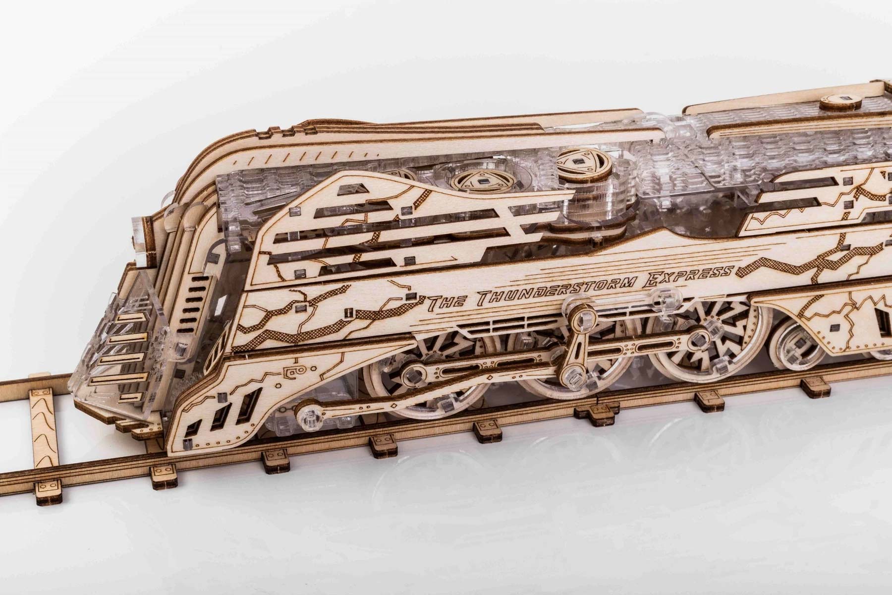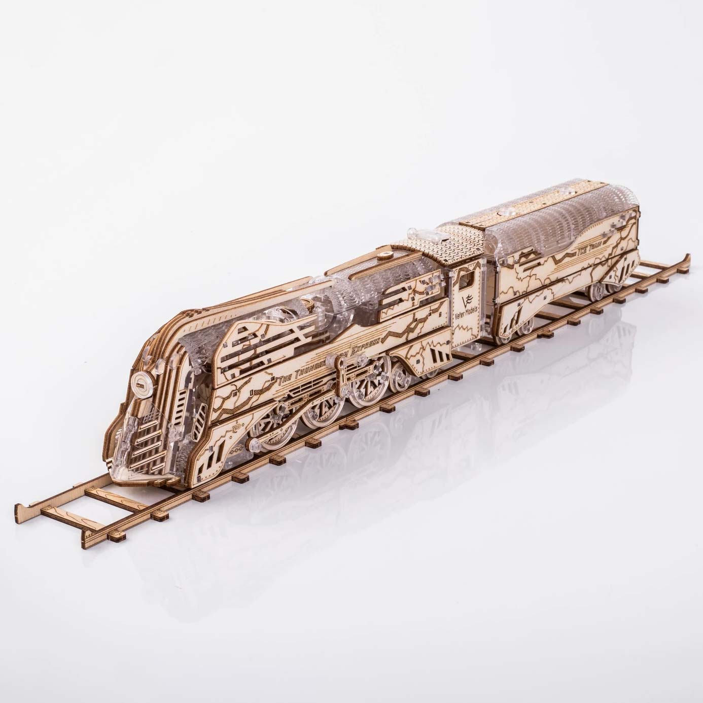 Der Thunderstorm Express mit Tender ist ein DIY-Bausatz von Veter Models für Erwachsene. Das aufgebaute Modell kann durch einen Aufziehmotor bis zu drei Meter selbstständig fahren. Die Tür zum Führerstand und eine mechanische Klappe können geöffnet werden. Die Lokomotive verfügt über einen 3-Kolben Motor, einem Tender mit automatischer Kupplung und einem öffnenbaren Laderaum am Tender, um etwas darin zu verstauen.